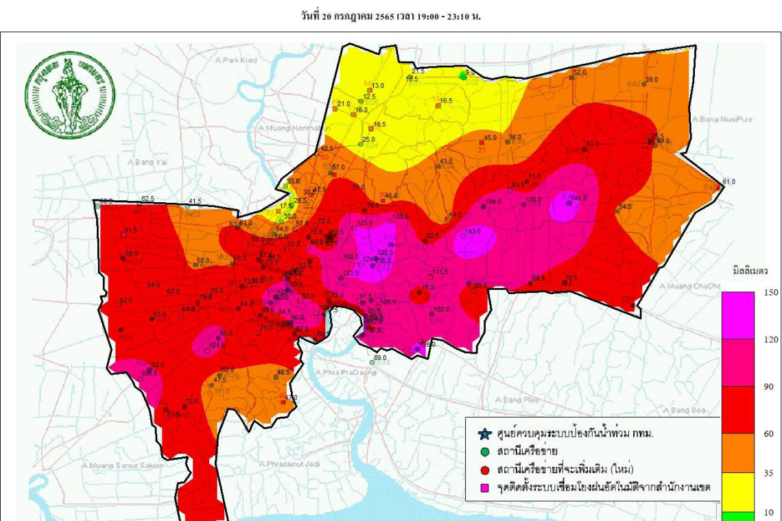 วันที่ 20 ก.ค.65 เพจ กรุงเทพมหานคร โดยสำนักงานประชาสัมพันธ์ โพสต์ข้อความว่า เมื่อเวลา 23.10 น. ศูนย์ควบคุมระบบป้องกันน้ำท่วมกรุงเทพมหานคร รายงานสถานการณ์ฝนในกรุงเทพมหานครมีฝนตกปกคลุมทั่วพื้นที่กรุงเทพฯ ทั้งหมด ตั้งแต่เวลา 19.00 น. เป็นต้นไปต่อเนื่อง และตกหนักในหลายพื้นที่ โดยปริมาณฝนสูงสุดวัดได้ 143 มิลลิเมตรที่สำนักงานเขตสะพานสูง 139 มิลลิเมตรที่เขตมีนบุรี และ 130 มิลลิเมตรที่เขตวัฒนา ส่วนความรุนแรงของฝนสูงสุดวัดได้ที่สถานี