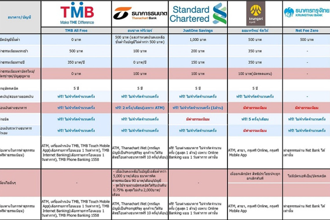 เห็นได้จากตารางการเปรียบเทียบบริการทางการเงินในด้านต่างๆ ของแต่ละธนาคาร เช่น การโอนเงินต่างธนาคาร ธนาคารธนชาต สามารถ ให้บริการโอนเงินต่างธนาคารได้ฟรี! 2 ครั้ง/เดือน(เฉพาะ ATM) ธนาคารสแตนดาร์ดชาร์เตอร์ถ้าโอนตั้งแต่ 1ล้าน มีค่าธรรมเนียมในการให้บริการ ด้านธนาคารกรุงศรี และธนาคารกรุงไทยมีค่าธรรมเนียมในการให้บริการ หรืออย่างการให้บริการจ่ายบิล ก็ยังมีบางธนาคารที่คิดค่าธรรมเนียม เหล่านี้เป็นต้นสำหรับการคิดค่าธรรมเนียม