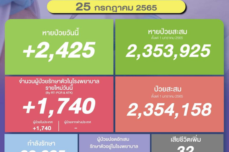 วันที่ 24 ก.ค.2565 ศูนย์ข้อมูล COVID-19 รายงานยอดผู้ติดเชื้อโควิด-19 รายใหม่จำนวน 1,740 ราย ทำให้ยอดผู้ป่วยสะสมตั้งแต่ 1 มกราคม 2565 มีจำนวน 2,354,158 ราย หายป่วยกลับบ้าน 2,425 ราย ทำให้ยอดหายป่วยสะสม ตั้งแต่ 1 มกราคม 2565 มีจำนวน 2,353,925 ราย ผู้ป่วยกำลังรักษา 23,985 ราย และเสียชีวิต 33 ราย รวมเสียชีวิตสะสมตั้งแต่ ปี 2563-ปัจจุบัน จำนวน 31,189 ราย