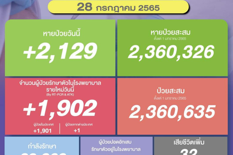วันที่ 28 ก.ค.2565 ศูนย์ข้อมูล COVID-19 รายงานยอดผู้ติดเชื้อโควิด-19 รายใหม่จำนวน 1,902ราย ทำให้ยอดผู้ป่วยสะสมตั้งแต่ 1 มกราคม 2565 มีจำนวน 2,360,635 ราย หายป่วยกลับบ้าน 2,129 ราย ทำให้ยอดหายป่วยสะสม ตั้งแต่ 1 มกราคม 2565 มีจำนวน 2,360,326 ราย ผู้ป่วยกำลังรักษา 23,960 ราย และเสียชีวิต 32 ราย รวมเสียชีวิตสะสมตั้งแต่ ปี 2563-ปัจจุบัน จำนวน 31,290 ราย