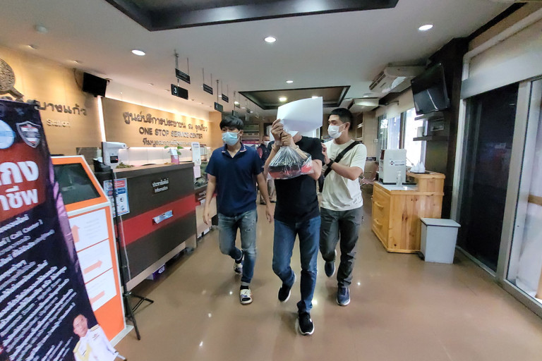 โดยจับกุมตัวได้ที่หน้าร้านโรงเบียร์ชนบท ตลาดษมาภรณ์ ปากซอยบางปลา 2 หมู่ 11 ต.บางปลา อ.บางพลี จ.สมุทรปราการ ก่อนนำตัวไปตรวจค้นที่ห้องเช่า เลขที่ 207 ชั้น 2 เอที แมนชั่น ซึ่งอยู่ภายในซอยยามาโมโต้ ถนนเทพารักษ์  หมู่ 7 ต.เทพารักษ์ อ.เมือง จ.สมุทรปราการ สามารถตรวจยึดของกลางที่วางอยู่ในห้องดังกล่าวได้ทั้งหมด ก่อนคุมตัวมาทำการสอบสวนที่โรงพัก สภ.บางแก้ว พร้อมประสานแจ้งผู้เสียหายมาดูตัวชายคนดังกล่าว และผู้เสียหายได้ชี้ยืนยันว่าชายคนดังกล่าว เป็นคนร้ายที่ก่อเหตุจริง รวมทั้งทรัพย์สินที่ตรวจยึดมาผู้เสียหายได้ชี้ยืนยันว่าเป็นทรัพย์ของตนที่ถูกคนร้ายลักมา