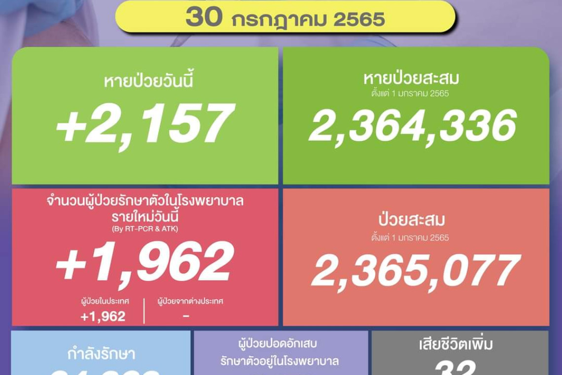 วันที่ 30 ก.ค.2565 ศูนย์ข้อมูล COVID-19 รายงานยอดผู้ติดเชื้อโควิด-19 รายใหม่จำนวน 1,962 ราย ทำให้ยอดผู้ป่วยสะสมตั้งแต่ 1 มกราคม 2565 มีจำนวน 2,365,077 ราย หายป่วยกลับบ้าน 2,157 ราย ทำให้ยอดหายป่วยสะสม ตั้งแต่ 1 มกราคม 2565 มีจำนวน 2,364,336 ราย ผู้ป่วยกำลังรักษา 24,323 ราย และเสียชีวิต 32 ราย รวมเสียชีวิตสะสมตั้งแต่ ปี 2563-ปัจจุบัน จำนวน 31,359 ราย
