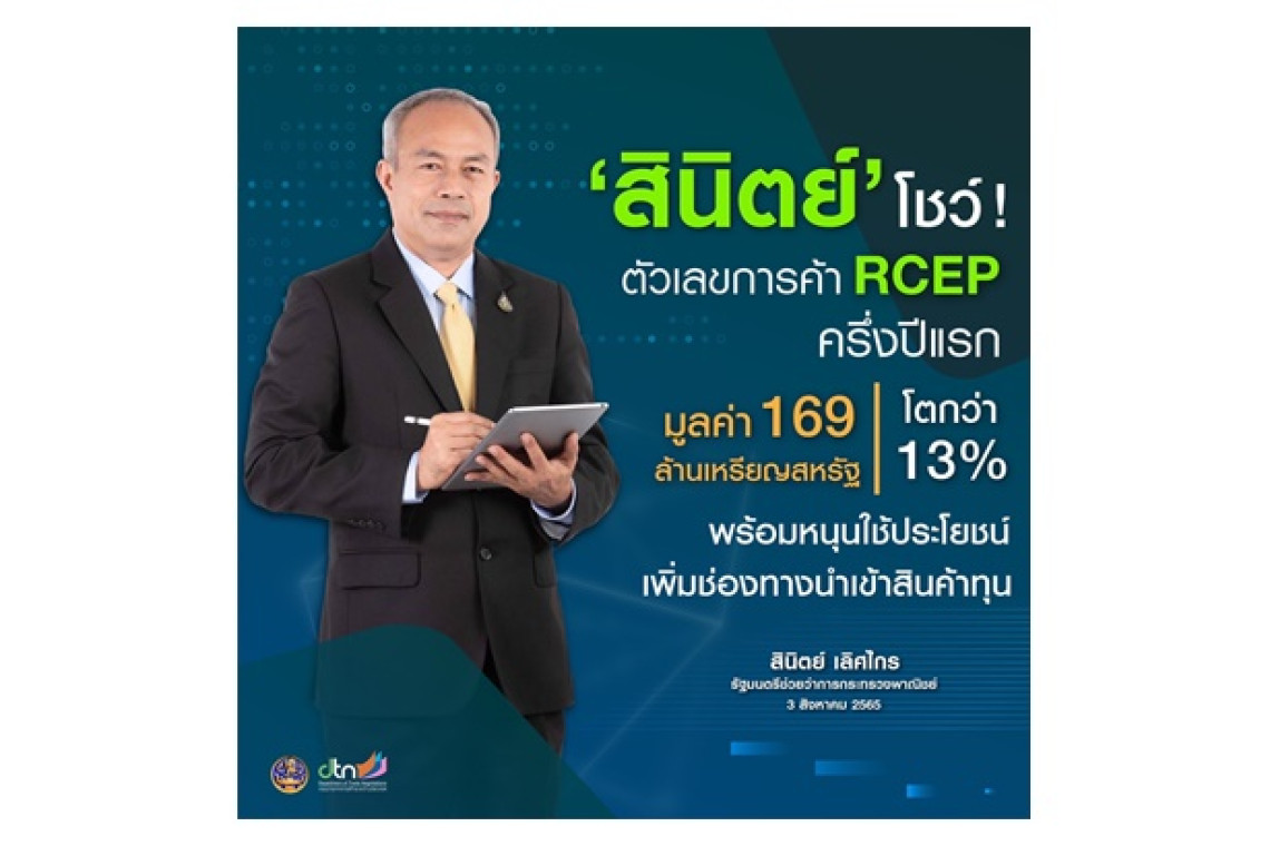 นายสินิตย์ เลิศไกร รมช.พาณิชย์ เปิดเผยว่า ได้มอบหมายให้กรมเจรจาการค้าระหว่างประเทศ ติดตามสถิติการค้าของไทยกับกลุ่มประเทศสมาชิก RCEP ในช่วงครึ่งปีแรก โดยได้รับรายงานว่า นับจากความตกลงหุ้นส่วนทางเศรษฐกิจระดับภูมิภาค (RCEP) มีผลบังคับใช้เมื่อวันที่ 1 ม.ค.ผ่านมา การค้าระหว่างไทยกับประเทศสมาชิก RCEP ในช่วงครึ่งปีแรก (ม.ค.-มิ.ย.65) มีมูลค่ารวม 169,041 ล้านเหรียญสหรัฐ เพิ่มขึ้น 13% จากช่วงเดียวกันของปีก่อนหน้า โดยไทยส่งออกไปยังประเทศสมาชิก RCEP มูลค่า 78,172 ล้านเหรียญสหรัฐ เพิ่มขึ้น 9% ตลาดส่งออกสำคัญที่ขยายตัวได้ดี อาทิ อาเซียน จีน ญี่ปุ่น และเกาหลีใต้