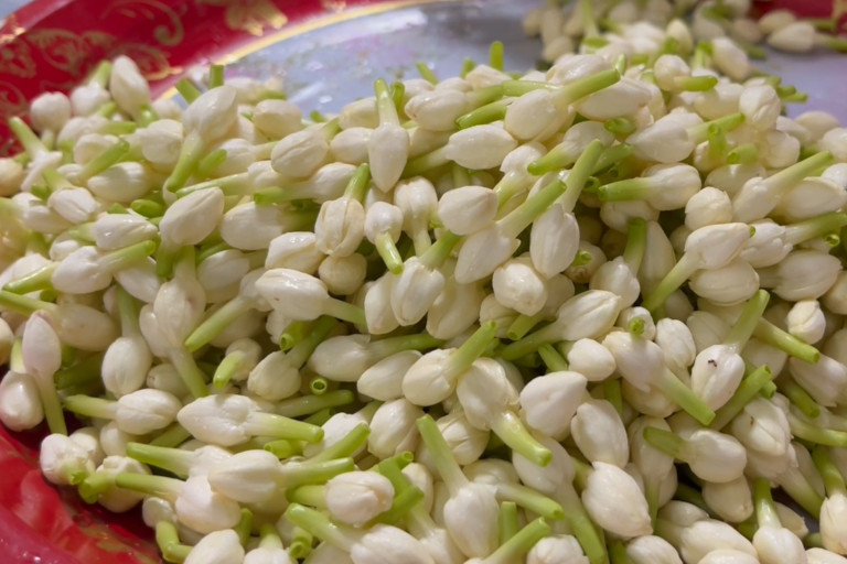 " สาเหตุที่ดอกมะลิขึ้นราคาเพราะใกล้ถึงวันแม่ปริมาณความต้องการเยอะขึ้นปกติ เดิมดอกมะลิกิโลกรัมละ 300 บาท แต่ช่วงนี้คนสั่งเยอะ แต่เกษตรกรก็มีอุปสรรคจากฝนที่ตกลงมาต่อเนื่องกว่า 1 สัปดาห์ ส่งผลให้ทำดอกมะลิโตไม่ทันใช้"