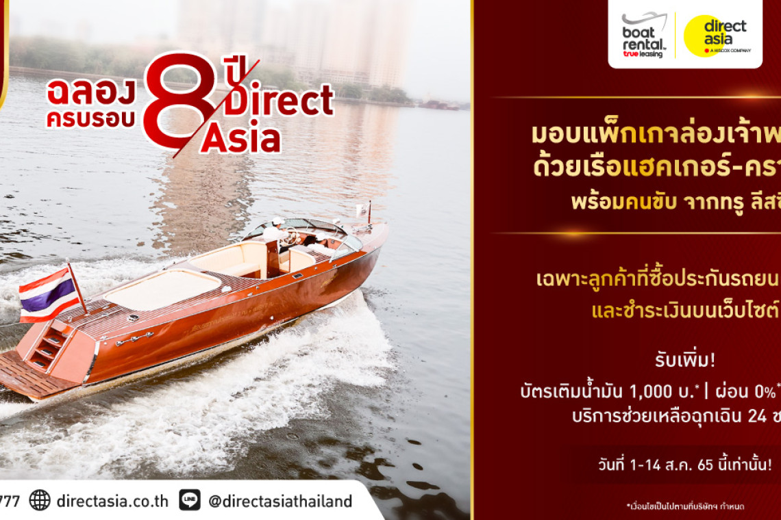 ในโอกาสที่ ไดเร็ค เอเชีย ดำเนินธุรกิจครบรอบ 8 ปี พร้อมอยู่กับคุณตั้งแต่ต้นจนจบ และเพื่อเป็นการขอบคุณลูกค้าที่ให้การสนับสนุนบริษัทฯ มาอย่างยาวนาน ไดเร็ค เอเชีย ขอมอบแพ็กเกจล่องเจ้าพระยาด้วยเรือแฮคเกอร์-คราฟต์ พร้อมคนขับ จาก ทรู ลีสซิ่ง* สำหรับลูกค้าที่ซื้อประกันภัยรถยนต์ชั้น 1 และชำระเงินบนเว็บไซต์ 10 กรมธรรม์แรก ตั้งแต่วันนี้ - 14 สิงหาคม 2565 นี้ สนใจ สามารถสอบถามเพิ่มเติมได้ที่เบอร์ 02-767-7777 หรือติดตามรายละเอียด และเงื่อนไขกิจกรรมได้ที่ https://www.directasia.co.th/promotion/8years/