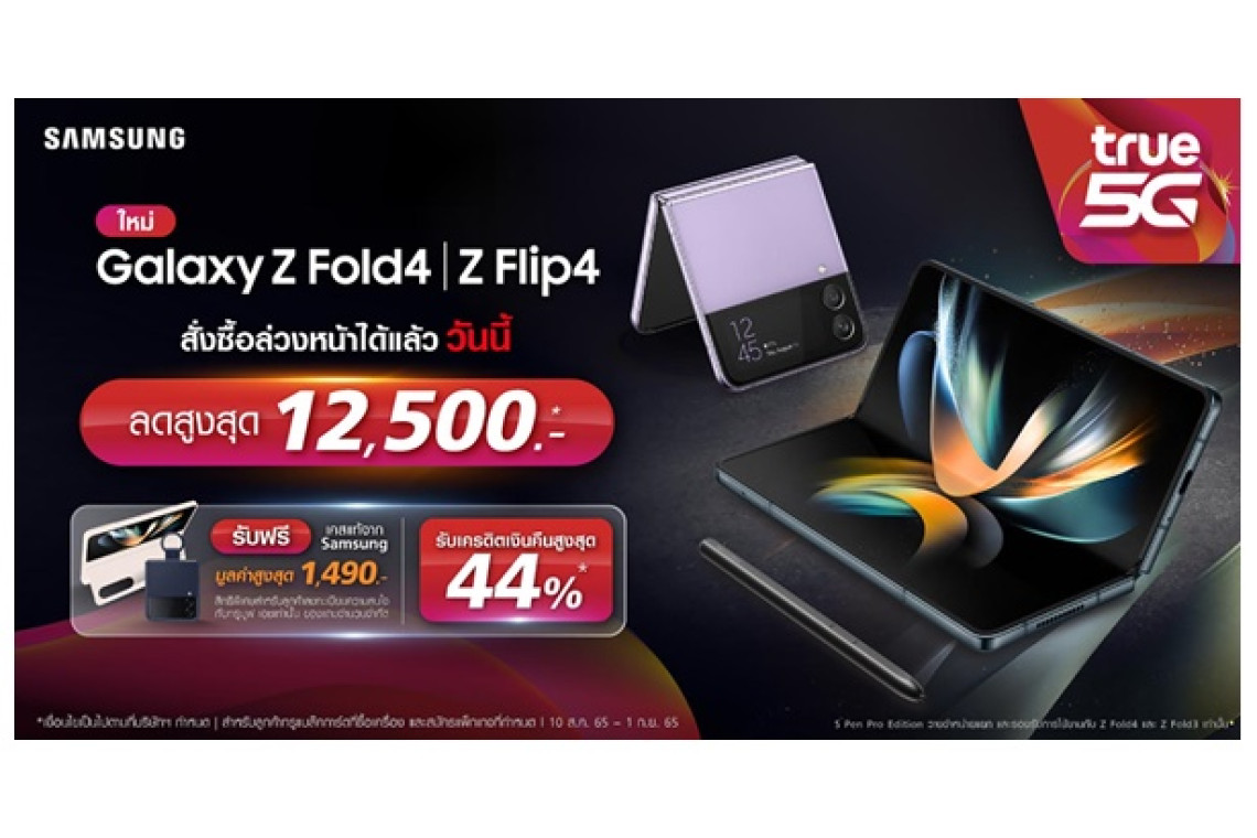 ทรู เปิดให้จองทันทีหลัง Samsung เปิดตัว Galaxy Z Fold4 และ Galaxy Z Flip4 พร้อมมอบส่วนลดสูงสุด 12,500 บาท พิเศษ!! ใช้ทรูพ้อยท์แลกรับส่วนลดเพิ่มอีก 1,000 บาท ตั้งแต่วันนี้-1 ก.ย.นี้เท่านั้น