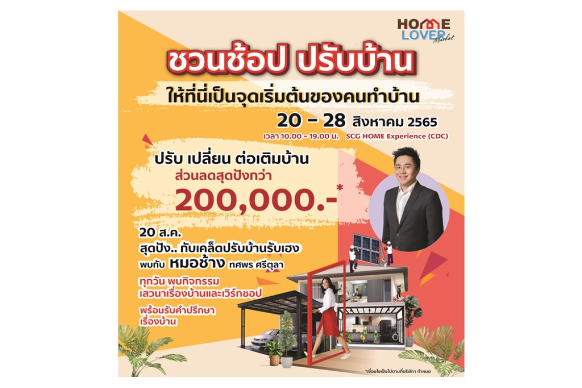 ทั้งนี้ปิดท้ายด้วยกิจกรรมสำหรับสายประดิษฐ์ DIY Workshop ที่ชวนรังสรรค์ผลงานแบบไม่ซ้ำใครตลอดการจัดงาน พิเศษสุดในงานกับ โปรโมชันที่ต่อคิวลดสนั่นทุกสินค้าและบริการ รวมส่วนลดกว่า 200,000 บาท พิเศษสำหรับสมาชิก SCG Family รับคะแนน 10 เท่าเมื่อช้อปสินค้าและบริการ และในงานนี้เปิดโอกาสให้คนรักบ้านที่ต้องการคำปรึกษาดีๆ สามารถแวะเวียนมาพบผู้เชี่ยวชาญได้แบบ Exclusive เตรียมเปิดประตูต้อนรับคนรักบ้านแล้วที่ SCG HOME Experience เลียบทางด่วนเอกมัย-รามอินทรา จัดยาวจุใจตลอด 9 วันเต็ม วันที่ 20-28 สิงหาคม 2565 ตั้งแต่เวลา 10.00-19.00 น. สอบถามรายละเอียดเพิ่มเติม พิเศษสุดๆ! รับคูปองส่วนลดมูลค่า 12,000 บาท เพียงแจ้งโค้ด HLM22 ณ จุดให้บริการ SCG HOME Experience ตลอด 9 วัน (เงื่อนไขเป็นไปตามที่บริษัทฯ กำหนด)