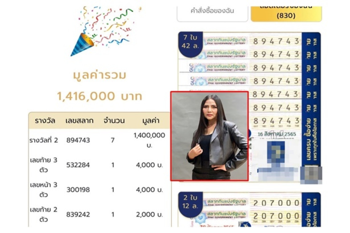 “สุนารี ราชสีมา” เจ๊ใหญ่แห่งวงการลูกทุ่งไทย ถึงกับกรี๊ดลั่นบ้าน หลังถูกลอตเตอรี่ ได้รับเงินรางวัล 1,416,000 บาท งวดประจำวันที่ 16 สิงหาคม 2565 โพสต์ภาพผ่านอินสตาแกรมส่วนตัวว่า ตื่นเช้ามาตกใจหมดเลย มีเงินเข้าบัญชีล้านกว่าบาท พอดูข้อความสุถูกรางวัลที่ 2 เป็นการตัดสินใจซื้อเพิ่มที่ปังมาก นาทีสุดท้ายกดแหลก รวมแล้ว 830 ใบ ไม่อยากเชื่อเลยรางวัลที่ 2 มาทั้งหมด 7 ใบเต็ม