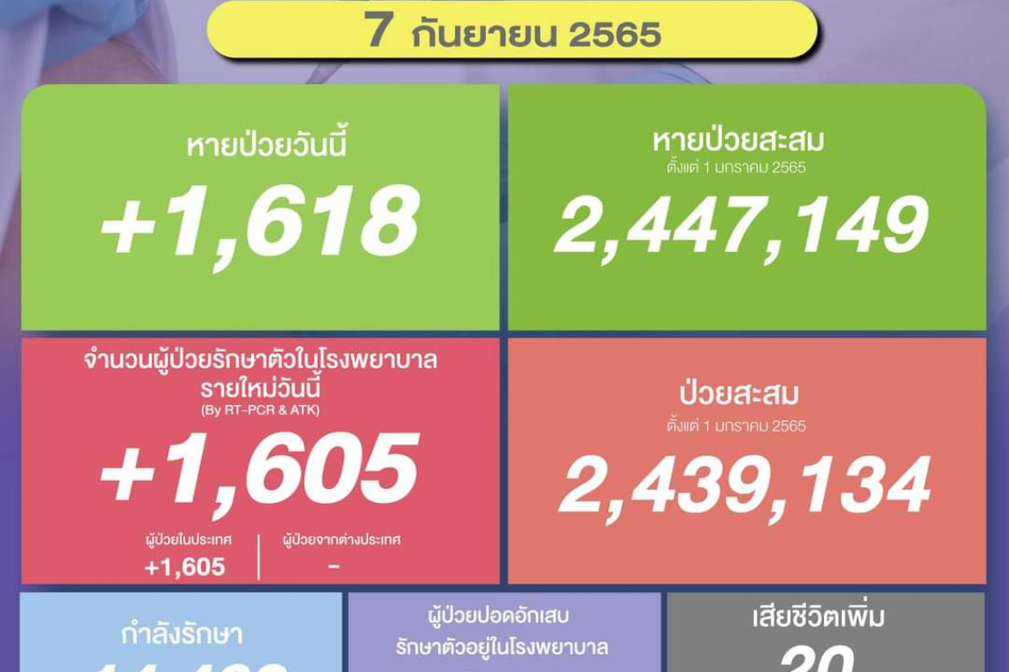 วันที่ 7 ก.ย.2565 ศูนย์ข้อมูล COVID-19 รายงานยอดผู้ติดเชื้อโควิด-19 รายใหม่วันนี้จำนวน 1,605 ราย แบ่งเป็นผู้ป่วยในประเทศ 1,605 ราย มาจากต่างประเทศ 0 ราย ทำให้ยอดผู้ป่วยสะสมตั้งแต่ 1 มกราคม 2565 มีจำนวน 2,439,134 ราย หายป่วยกลับบ้าน 1,618 ราย ทำให้ยอดหายป่วยสะสม ตั้งแต่ 1 มกราคม 2565 มีจำนวน 2,447,149 ราย ผู้ป่วยกำลังรักษา 14,462 ราย และเสียชีวิต 20 ราย รวมเสียชีวิตสะสมตั้งแต่ ปี 2563-ปัจจุบัน จำนวน 32,437 ราย
