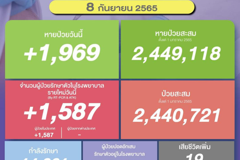 วันที่ 8 ก.ย.2565 ศูนย์ข้อมูล COVID-19 รายงานยอดผู้ติดเชื้อโควิด-19 รายใหม่วันนี้จำนวน 1,587 ราย แบ่งเป็นผู้ป่วยในประเทศ 1,587 ราย มาจากต่างประเทศ 0 ราย ทำให้ยอดผู้ป่วยสะสมตั้งแต่ 1 มกราคม 2565 มีจำนวน 2,440,721 ราย หายป่วยกลับบ้าน 1,969 ราย ทำให้ยอดหายป่วยสะสม ตั้งแต่ 1 มกราคม 2565 มีจำนวน 2,449,118 ราย ผู้ป่วยกำลังรักษา 14,061 ราย และเสียชีวิต 19 ราย รวมเสียชีวิตสะสมตั้งแต่ ปี 2563-ปัจจุบัน จำนวน 32,456 ราย