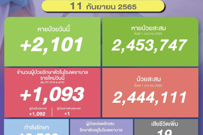 วันที่ 11 ก.ย.2565 ศูนย์ข้อมูล COVID-19 รายงานยอดผู้ติดเชื้อโควิด-19 รายใหม่วันนี้จำนวน 1,093 ราย แบ่งเป็นผู้ป่วยในประเทศ 1,092 ราย มาจากต่างประเทศ 1 ราย ทำให้ยอดผู้ป่วยสะสมตั้งแต่ 1 มกราคม 2565 มีจำนวน 2,444,111 ราย หายป่วยกลับบ้าน 2,101 ราย ทำให้ยอดหายป่วยสะสม ตั้งแต่ 1 มกราคม 2565 มีจำนวน 2,453,747 ราย ผู้ป่วยกำลังรักษา 12,766 ราย และเสียชีวิต 19 ราย รวมเสียชีวิตสะสมตั้งแต่ ปี 2563-ปัจจุบัน จำนวน 32,512 ราย