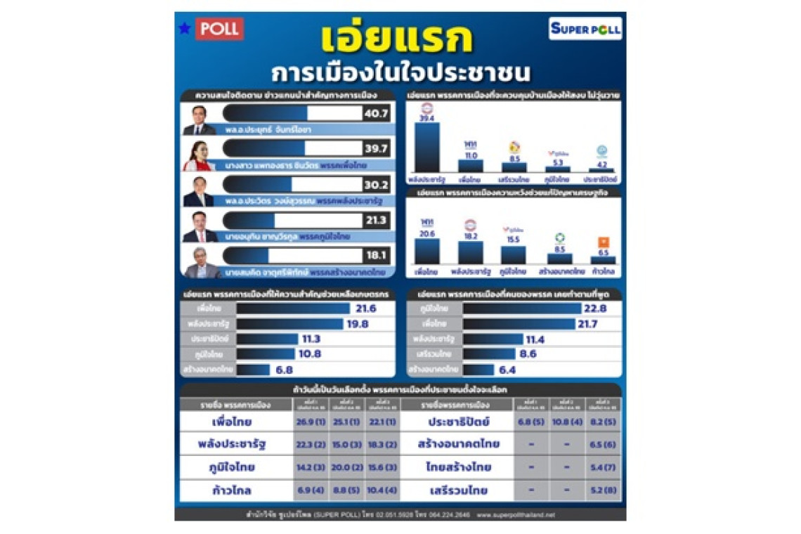 วันที่11 ก.ย.65 นายนพดล กรรณิกา ผู้อำนวยการสำนักวิจัยซูเปอร์โพล (SUPER POLL) เสนอผลสำรวจ เรื่อง เอ่ยแรก การเมืองในใจประชาชน กรณีศึกษาประชาชนทุกสาขาอาชีพทั่วประเทศ ดำเนินโครงการทั้งการวิจัยเชิงปริมาณ (Quantitative Research) และการวิจัยเชิงคุณภาพ (Qualitative Research) ผ่านกระบวนการวิจัยเชิงทดลอง(Experimental Survey) เพื่อลดความคลาดเคลื่อนแก้ปัญหาแหล่งความคลาดเคลื่อนจากผู้ถามผู้ตอบและเครื่องมือวัด จำนวน 1,425 ตัวอย่าง ระหว่างวันที่ 8 – 10 กันยายน พ.ศ. 2565 ที่ผ่านมา โดยมีค่าความคลาดเคลื่อนจากการกำหนดขนาดตัวอย่างบวกลบร้อยละ 5 ในช่วงความเชื่อมั่นร้อยละ 95