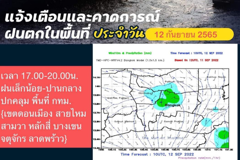 วันที่ 12 ก.ย.2565 เพจเฟซบุ๊ก กรุงเทพมหานคร โดยสำนักประชาสัมพันธ์ โพสต์แจ้งเตือนฝนตกเล็กน้อยถึงปานกลาง ในพื้นที่กทม.ช่วง 17.00 น. ถึง 20.00 น. คืนนี้ ทั้งหมด 6เขต ได้แก่ เขตดอนเมือง, สายไหม, คลองสามวา, หลักสี่, บางเขน, จตุจักรและลาดพร้าว เป็นข้อมูลจากกรมอุตุนิยมวิทยาที่คาดการณ์ไว้ ซ้ำเติมจุดเดิมที่น้ำยังท่วมขังในหลายพื้นที่อยู่ขณะนี้