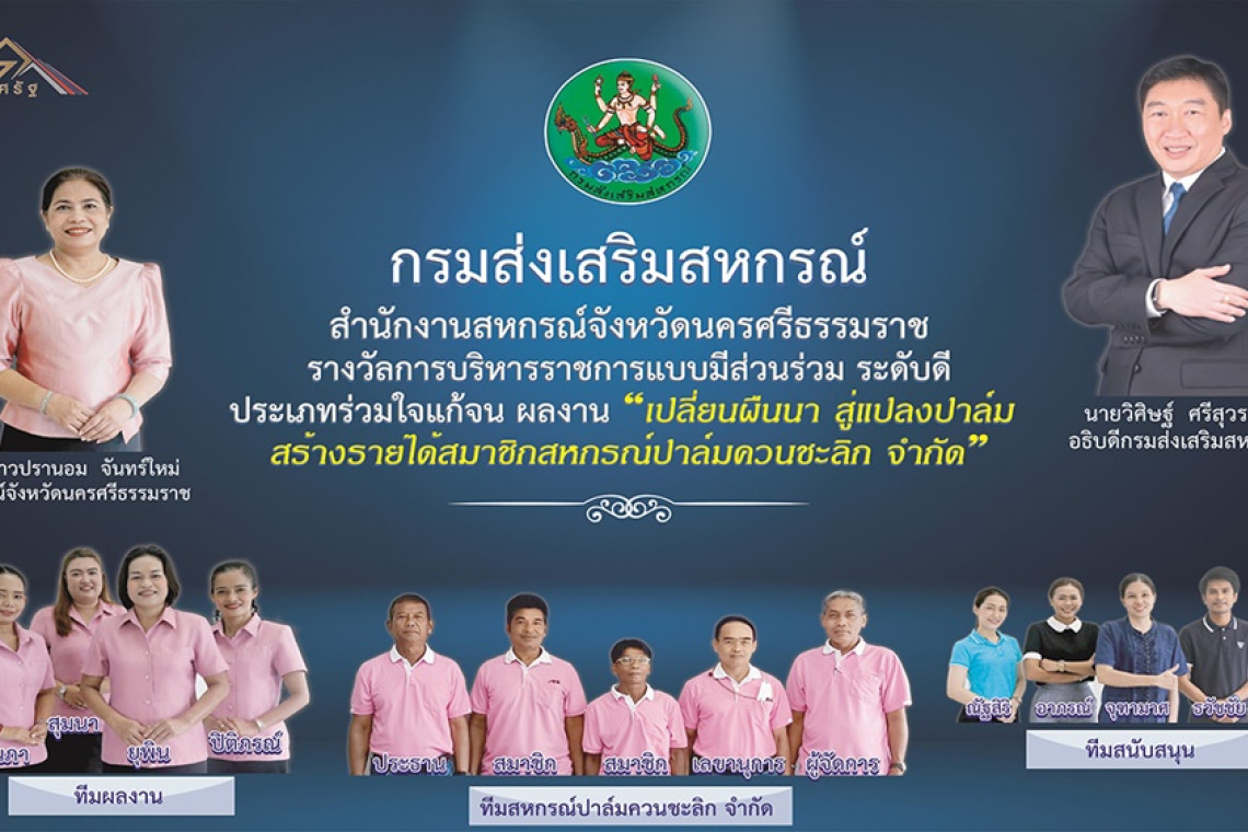 เมื่อวันที่ 12 ก.ย.65 นางสาวปรานอม จันทร์ใหม่ สหกรณ์จังหวัดนครศรีธรรมราช พร้อมด้วยบุคลากรสำนักงานสหกรณ์จังหวัด และคณะกรรมการดำเนินการของสหกรณ์ปาล์มควนชะลิก จำกัด เข้าร่วมรับรางวัลเลิศรัฐ ปี 2565 จากสำนักงานคณะกรรมการพัฒนาระบบราชการ (ก.พ.ร.) ผ่านระบบ Zoom Meeting ณ ห้องประชุมสำนักงานสหกรณ์จังหวัดนครศรีธรรมราช ซึ่งสำนักงานสหกรณ์จังหวัดนครศรีธรรมราช กรมส่งเสริมสหกรณ์ ได้รับรางวัลเลิศรัฐ สาขาการบริหารราชการแบบมีส่วนร่วม ประเภทร่วมใจแก้จน ระดับดี ผลงานเรื่อง “เปลี่ยนผืนนา สู่แปลงปาล์ม สร้างรายได้สมาชิก สหกรณ์ปาล์มควนชะลิก จำกัด”