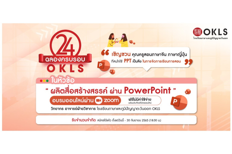 OKLS โรงเรียนภาษาและภูมิปัญญาตะวันออก เชิญชวนคุณครูทั่วประเทศไทยร่วมอบรมออนไลน์ “ผลิตสื่อสร้างสรรค์ ผ่าน PowerPoint” จำนวน 12 ชั่วโมง ระยะเวลา 2 วัน ฟรี ในโอกาสครบรอบ 24 ปี OKLS ครอบคลุมทั้งภาคทฤษฎีและฝึกปฏิบัติ โดยคณะวิทยากรผู้เชี่ยวชาญของ OKLS แนะนำเทคนิคในการใช้งาน ตลอดถึงการออกแบบการสอนในรูปแบบเกม พร้อมรับเกียรติบัตรหลังจบการอบรม ตอกย้ำการเป็นโรงเรียนสอนภาษาจีน-ญี่ปุ่น ที่ส่งเสริมการเรียนรู้ทักษะทางภาษาอย่างรอบด้าน และเป็นผู้เชี่ยวชาญในการจัดหลักสูตรการเรียนการสอนให้แก่ทุกประเภทองค์กร ทั้งภาคการศึกษา และภาคธุรกิจ