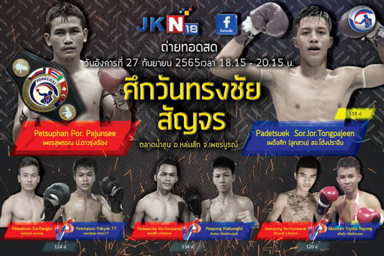 “ศึกวันทรงชัยสัญจร” พบแฟนมวย ในวันอังคารที่ 27 กันยายนนี้ ชูโรงด้วยคู่ชกที่ไม่เคยพบกันมาก่อน มีเข็มขัดแชมป์วันทรงชัยรุ่น118 ป. เป็นเดิมพัน ระหว่าง “เสือยิ้มยาก” เพชรสุพรรณ ป.ประจันสี ปะทะ “ขุนเข่าไร้พ่าย” ผู้ไม่เคยแพ้ใคร เผด็จศึก สจ.โต้งปราจีน เดือดทุกวินาทีแน่นอน JKN18 ถ่ายทอดสดให้ได้รับชมพร้อมกันทั่วประเทศ