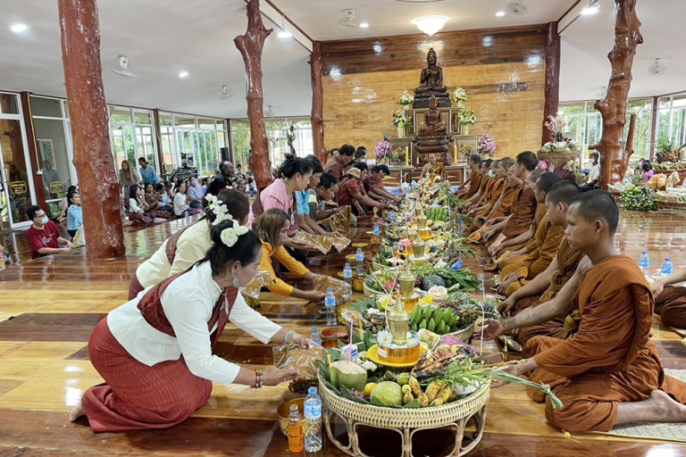 ในพลบค่ำของวัน เป็นช่วงเวลาที่แต่ละบ้านจัดตั้งเครื่องเซ่นไหว้ บ้านหลังใหญ่ของตระกูลพรหมชื่น ดูคับแคบไปถนัดตาเมื่อลูกหลานที่จากไปทำงานต่างถิ่น พร้อมใจกลับบ้านเกิดเพื่อร่วมพิธี คือประเพณีสำคัญประจำปีในพื้นที่ชุมชนชาวไทยเชื้อสายเขมร รวมถึงฝั่งกัมพูชา "ฝั่งโน้นก็มีเหมือนกัน แต่จะต่างที่วิธีปฏิบัติบางอย่าง แต่มาจากความเชื่อเดียวกัน" นายเอี้ยง ยิ่งดัง กรรมการสภาวัฒนธรรมชุมชนวัดศิลาอาสนาราม จ.สุรินทร์ กล่าวเช่นเดียวกับ นายชัย ผิวละออง และนายฉัตรชัย พรหมชื่น ชาวบ้านบ้านกะโงก จ.สุรินทร์ ที่ระบุว่าจะต้องกลับบ้านมาทุกปี ไม่ว่าอยู่ที่ไหนก็ต้องกลับมา ช่วงเดือน 10 ของทุกปีมีประเพณีบูชาบรรพบุรุษที่เรียกแตกต่างกันไปในแต่ละพื้นที่ ไม่ว่าแซนโฎนตา หรือ บุญข้าวสาก ต่างมีความหมายเดียวกัน นอกจากเป็นเครื่องหมายความกตัญญู ยังร้อยสัมพันธ์ในครอบครัวผ่านประเพณีของชุมชน