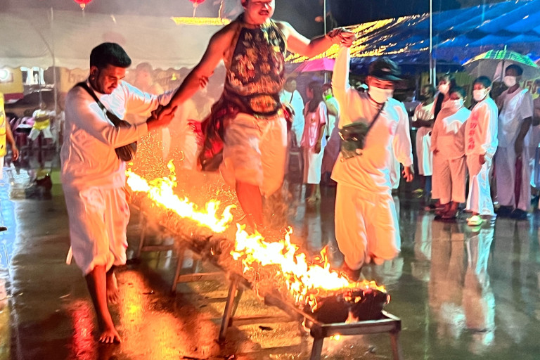เมื่อวันที่ 28 กันยายน 2565 ช่วงค่ำคืนที่สามของเทศกาลถือศิลกินผักจังหวัดระนอง   ที่ลานเอนกประสงค์เทศบาลเมืองระนอง  ชาวระนองและนักท่องเที่ยวต่างเข้าร่วมพิธีกรรมสะเดาะเคราะห์ ในยามค่ำกันอย่างคึกคัก  โดยศาลเจ้าเทียนซ่งเซ่งโบ้ว   บ้านปากคลอง  ได้มีการอัญเชิญเหล่าเทพเจ้ามาประทับร่างม้าทรงจำนวนนับสิบ    มีพิธีล้อมวงแสดงอิทธิฤทธิ์ เชือดลิ้น และสับแผ่นหลังด้วยอาวุธมีด ขวาน,ทวนยาว,และกระบองหนาม  จากนั้นมีการอาบประทัดร้อยสาย เสียงดังสนั่นไปทั่วลาน  ตามด้วยอาบและย่ำกระเบื้องขวดที่เตรียมไว้ในกระบะ  โดยม้าทรงลงไปนั่งทับพร้อมใช้มือกอบเศษกระเบื้องขวดขึ้นรดหน้า และย่ำเดิน  สุดท้ายพิธีกรรมข้ามสะพานไฟไม้หมาก ที่นำมาตั้งเป็นสะพานแล้วจุดไฟเผาเป็นทางยาวร่วม 15 เมตร  ม้าทรงได้ออกวิ่งและเดินข้าม มาครั้งมีพี่เลี้ยงพระร่วมประคองมือให้เดินผ่านบนสะพานไม้หมากที่ลุกเป็นไฟ