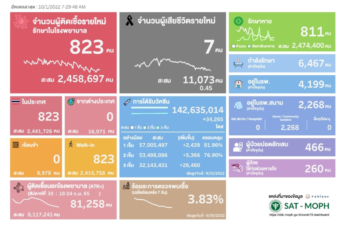 วันที่ 1 ต.ค..2565 กรมควบคุมโรค กระทรวงสาธารณสุข รายงานยอดผู้ติดเชื้อโควิด-19 รายใหม่วันนี้จำนวน 823 ราย แบ่งเป็นผู้ป่วยในประเทศ 823 ราย มาจากต่างประเทศ 0 ราย ทำให้ยอดผู้ป่วยสะสมตั้งแต่ 1 มกราคม 2565 มีจำนวน 2,458,697 ราย หายป่วยกลับบ้าน 811 ราย ทำให้ยอดหายป่วยสะสม ตั้งแต่ 1 มกราคม 2565 มีจำนวน 2,474,400 ราย ผู้ป่วยกำลังรักษา 6,467 ราย และเสียชีวิต 7 ราย รวมเสียชีวิตสะสมตั้งแต่ ปี 2563-ปัจจุบัน จำนวน 32,744 ราย