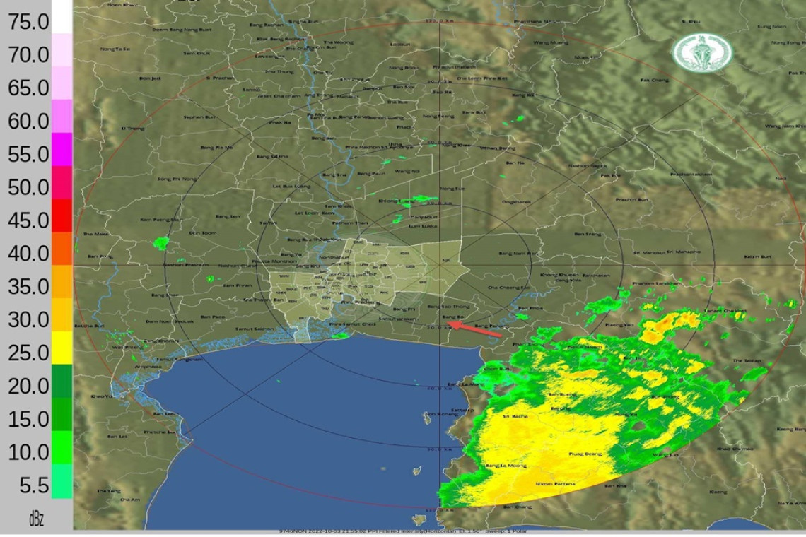 วันที่ 3 ตุลาคม 2565 / เวลา 22.00 น. พื้นที่ กทม. ไม่พบกลุ่มฝน / ฝนเล็กน้อย - ปานกลาง จ.ชลบุรี เคลื่อนตัวทิศตะวันตกเฉียงเหนือ คาดหากไม่อ่อนกำลังลงจะเข้า กทม. ในอีก 1 ชั่วโมง