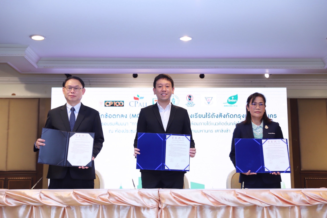 วันที่ 5 ต.ค.2565 ที่ศาลาว่าการกทม.เสาชิงช้า นายศานนท์ หวังสร้างบุญ รองผู้ว่าราชการกรุงเทพมหานคร ลงนามความร่วมมือภาคีเครือข่ายโรงเรียนไร้ถัง ร่วมกับ นายยุทธศักดิ์ ภูมิสุรกุล ประธานเจ้าหน้าที่บริหาร บริษัท ซีพีออล์ จำกัด(มหาชน) พร้อมด้วย นายสุวิทย์ กิ่งแก้ว ที่ปรึกษาอาวุโส บริษัท ซีพีออล์ จำกัด(มหาชน) และนายตรีเทพ ปาลกะวงศ์ ณ อยุธยา ประธานคณะทำงานโครงการสานอนาคตการศึกษา CONNEXT ED บมจ.ซีพีออลล์ ร่วมเป็นสักขีพยาน โดยกรุงเทพมหานคร ได้นำโรงเรียนในสังกัด กทม.จำนวน 437 แห่ง เข้าร่วมเป็นสมาชิกภาคีในฐานะ “โรงเรียนไร้ถังสังกัดกรุงเทพมหานคร” เพื่อร่วมกับองค์กรภาคเอกชนกว่า 10 แห่ง และ 443 โรงเรียนในสังกัดสำนักงานคณะกรรมการการศึกษาขั้นพื้นฐาน(สพฐ.) ทั่วประเทศ ปลูกฝังให้เกิดการแยกขยะตั้งแต่ต้นทางให้กับเยาวชนและชุมชน แก้ปัญหาการจัดการขยะ ซึ่งเป็นปัญหาใหญ่และวาระสำคัญของประเทศ