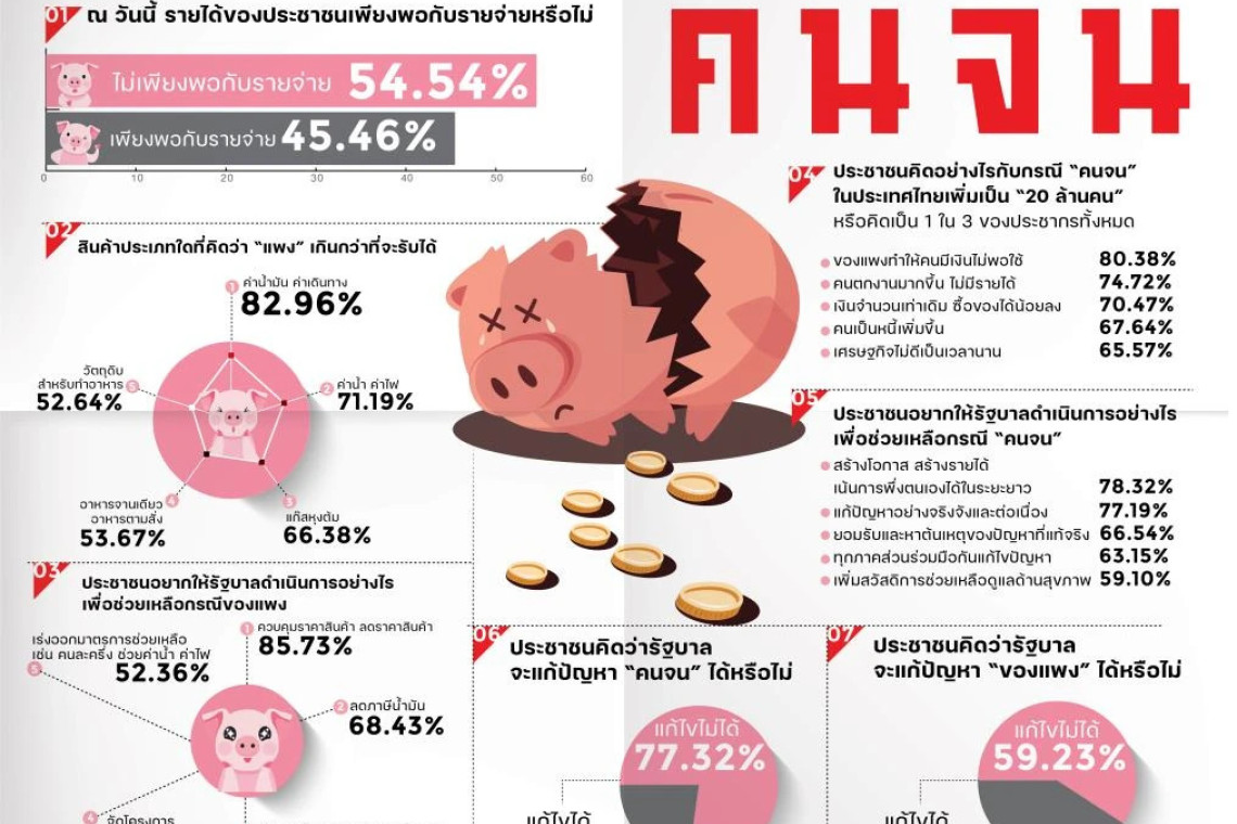 ผู้ช่วยศาสตราจารย์ ดร.จิตต์วิมล คล้ายสุบรรณ อาจารย์ประจำคณะครุศาสตร์ มหาวิทยาลัยสวนดุสิต เปิดเผยว่า ในปัจจุบันประชาชนได้รับผลกระทบจากสถานการณ์โควิด-19 โดยเฉพาะระบบเศรษฐกิจและการจ้างงาน ทำให้คนตกงานมากขึ้น ไม่มีรายได้ หรือบางคนถูกลดเงินเดือน จึงส่งผลให้คนมีรายได้ไม่เพียงพอต่อรายจ่ายของค่าครองชีพในชีวิตประจำวัน ซึ่งก็หมายถึงมีจำนวนคนจนมากขึ้นนั้นเอง เมื่อ “รายได้น้อยลง” แต่ “ของแพงขึ้น” จึงทำให้เงินที่มีอยู่ไม่เพียงพอสำหรับการเลี้ยงปากท้องในแต่ละวัน จากปัญหาถึงแม้รัฐบาลจะมีมาตรการช่วยเหลือค่าครองชีพของประชาชนอยู่หลายโครงการ ซึ่งเป็นการแก้ไขปัญหาระยะสั้น ดังนั้นการแก้ไขปัญหาระยะยาวโดยเฉพาะวางแผนในการแก้ไขปัญหาเชิงโครงสร้างทั้งระบบเป็นเรื่องที่ท้าทายรัฐบาลชุดนี้เพื่อให้เกิดผลอย่างเป็นรูปธรรมอย่างยั่งยืน โดยสิ่งสำคัญจะต้องดำเนินการอย่างต่อเนื่องโดยมีการปรับเปลี่ยนกลไกและวิธีการในการแก้ไขปัญหาให้สอดรับกับบริบททางเศรษฐกิจและสังคมในปัจจุบัน และสำหรับความตั้งใจของรัฐบาลที่ว่า “30 กันยายน 2565 คนจนจะหมดไป” ณ วันนี้ก็ยังไม่เห็นผลที่ชัดเจน จึงเป็นเรื่องที่จะต้องหาวิธีการแก้จนกันต่อไป