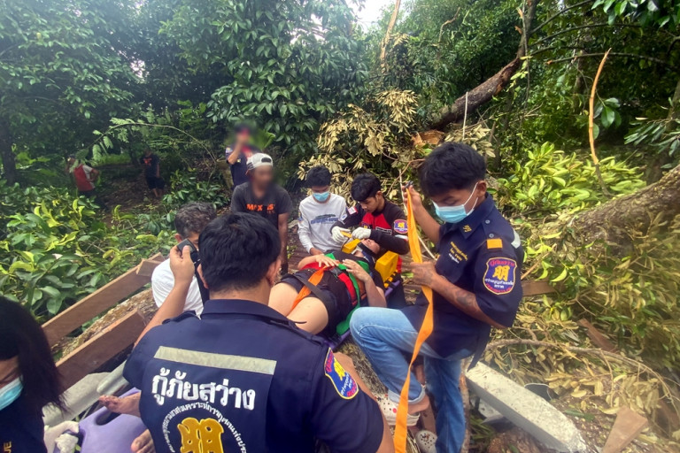 สอบถามเกตุการณ์จากลุงวัยกว่า 60 ปี ได้ความว่า เจ้าของบ้านได้ขายต้นไม้ คือ ต้นตะบากให้ผู้ซื้อจำนวน 2 ต้น และได้นำอุปกรณ์ทั้งแม่แรง และเลื่อยยนต์มาตัดต้นไม้ 2 ต้น ซึ่งอยู่ห่างจากบ้านที่เกิดเหตุ 30-40 เมตร ระหว่างที่กำลังตัดอยู่ และกำลังทำให้โค่นไปในทิศทางที่ต้องการ โดยการรั้งเชือก แต่ปรากฏว่า ต้นไม้ไม่ล้มไปในทิศทางที่ต้องการเนื่องจากมีกิ่งไม้ไปเกี่ยวกับต้นไม้ต้นอื่นๆ ทำให้ล้มลงมาทับต้นไม้ด้านข้าวบ้านที่มีทั้งทุเรียน และต้นเงาะขนาดใหญ่ข้างบ้านและทับบ้านบางส่วนจนได้รับความเสียหายทั้งหลังคา และฝาบ้าน รวมทั้งหญิงสาวที่ทำงานอยู่ในที่เกิดเหตุ ไม่สามารถลุกขึ้นมาได้ เนื่องจากเจ็บที่ได้หลังจึงได้ประสานให้เจ้าหน้าที่กู้ภัยสว่างบุญช่วยเหลือมานำตัวส่งโรงพยาบาลตราดดังกล่าว