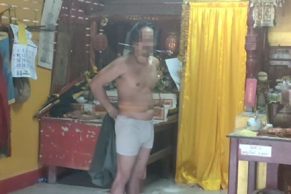 โดยขณะที่เจ้าหน้าที่ได้สอบถาม นายขวัญชัย คิดว่าตัวเองเป็นร่างทรงของเทพเจ้า จึงไปคว้าเอาเหล็กแหลมสำหรับแทงปากของม้าทรงในศาลเจ้า มาแทงปากตัวเอง เมื่อถามว่าเสพยาบ้าไปหรือไม่ เจ้าตัวบอกว่าเสพไป 3 เม็ด เพื่อเป็นการบูชาพระพุทธ พระธรรม พระสงฆ์ อุทิศการเสพยา ให้แก่ผู้ล่วงลับไปแล้ว เจ้าหน้าที่พยายามเกลี้ยกล่อมอยู่นาน แต่นายขวัญชัย ยังไม่ยอมสงบ จึงหลอกล่อเข้าไปอุ้มตัวออกมา สุดท้ายนายขวัญชัย ก็ทิ้งตัวลงไปนอนนิ่งอยู่บนพื้น เจ้าหน้าที่หิ้วตัวออกมา พาขึ้นรถกู้ภัยนำตัวไปส่ง รพ.กระบี่ เพื่อเข้ารับการบำบัดอาการติดยาเสพติด