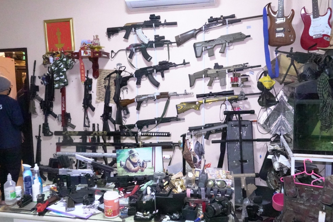 ​ผลการตรวจค้นพบ ​1.บีบีกัน จำนวน 46 กระบอก ​2.อาวุธปืนยาวขนาด .22 จำนวน 2 กระบอก (ไม่มีทะเบียน 1 กระบอก) ​3.เครื่องกระสุนขนาด .22 จำนวน 30 นัด จ้าหน้าที่ตำรวจจึงแจ้งข้อกล่าวหาว่า “มีอาวุธปืนไว้ในครอบครองโดยไม่ได้รับอนุญาต" จากนั้น พฐ. ได้เดินทางมาทำการตรวจพิสูจน์ปืนบีบีกันทั้งหมด โดยมี นายวิชวุทย์ จินโต ผู้ว่าราชการจังหวัดสุราษฎร์ธานี เข้าร่วมการตรวจสอบด้วย โดยหลังเสร็จสิ้นการตรวจสอบจะนำตัวพร้อมของกลาง นำส่งพนักงานสอบสวนเพื่อดำเนินคดีตามกฏหมายต่อไป