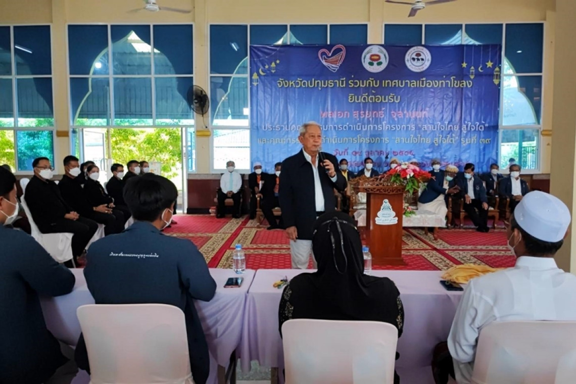 วันที่ 14 ต.ค.65 พลเอก สุรยุทธ์ จุลานนท์ ประธานคณะกรรมการอำนวยการ โครงการ "สานใจไทย สู่ใจใต้" และคณะกรรมการ ได้เดินทางมาที่มัสยิดอาลียิสซากิรอยน์ (ลำสนุ่น) ต.คลองสอง อ.คลองหลวง จ.ปทุมธานี เยี่ยมเยียนครอบครัวอุปลัมภ์ของคณะกรรมการดำเนินโครงการ"สานใจไทย สู่ใจได้" รุ่นที่ 39 โดยมีนายเอกวิทย์ มีเพียร รองผู้ว่าราชการจังหวัดปทุมธานี นายนิติชัย วิริยานนท์ นายอำเภอคลองหลวง นายสนั่น ล้ำประเสริฐ ประธานกรรมการอิสลามประจำจังหวัดปทุมธานี นายอุดม แมงทอง อิหม่ามประจำมัสยิดอาลียิสซากิรอยน์(ลำสนุ่น) นายสุเทพ วงษ์แจ้ง นายกเทศมนตรีเทศบาลเมืองท่าโขลง และเจ้าหน้าที่ข้าราชการให้การต้อนรับ