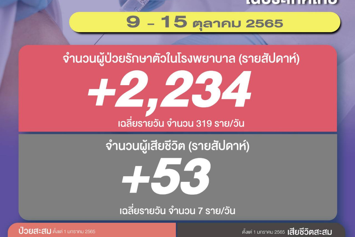 วันที่ 10 ต.ค.2565 ศูนย์ข้อมูล COVID-19 กรมประชาสัมพันธ์ รายงานสถานการณ์โรคโควิด-19 รายสัปดาห์ ระหว่างวันที่ 9-15 ตุลาคม 2565 พบผู้ติดเชื้อรายใหม่รักษาตัวในโรงพยาบาล (รพ.) 2,234 ราย เฉลี่ยวันละ 319 ราย สะสม 2,463,846 ราย สำหรับผู้เสียชีวิตรายใหม่ 53 ราย เฉลี่ยวันละ 7 ราย สะสม 11,184 ราย