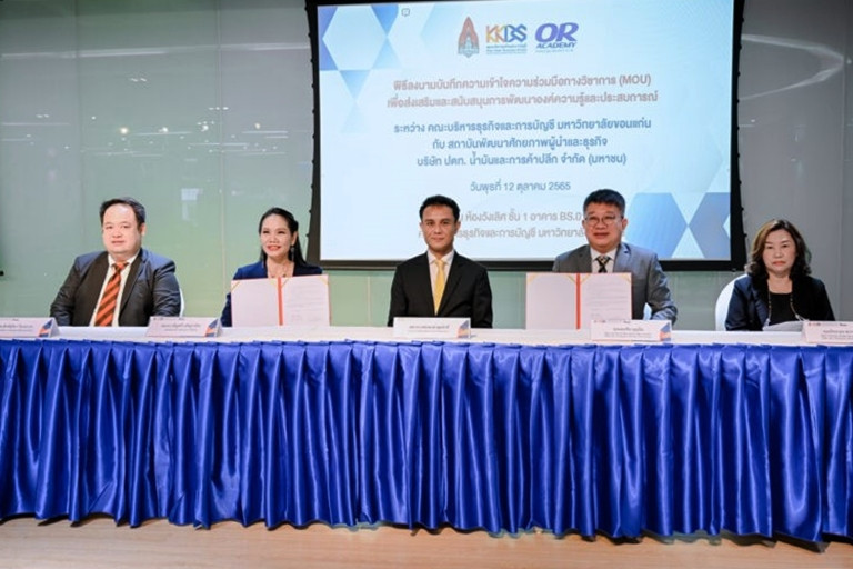 วันที่ 17 ต.ค.65 คณะบริหารธุรกิจและการบัญชี มหาวิทยาลัยขอนแก่น (มข.) จัดพิธีลงนามบันทึกความเข้าใจความร่วมมือทางวิชาการเพื่อส่งเสริมและสนับสนุนการพัฒนาองค์ความรู้และประสบการณ์ ระหว่าง คณะบริหารธุรกิจและการบัญชี มหาวิทยาลัยขอนแก่น กับ สถาบันพัฒนาศักยภาพผู้นำและธุรกิจ บริษัท ปตท. น้ำมันและการค้าปลีก จำกัด (มหาชน) โดยมี ผู้ช่วยศาสตราจารย์ ดร.เด่นพงษ์ สุดภักดี รองอธิการบดีฝ่ายดิจิทัล มหาวิทยาลัยขอนแก่น เป็นประธานในพิธี รองศาสตราจารย์ ดร.เพ็ญศรี เจริญวานิช คณบดีคณะบริหารธุรกิจและการบัญชี เป็นผู้กล่าวรายงาน ผู้ช่วยศาสตราจารย์ ศักดิ์สุริยา ไตรยราช ผู้ช่วยคณบดีฝ่ายการเรียนรู้ตลอดชีวิตและเครือข่าย กล่าวสรุปบันทึกข้อตกลงความร่วมมือทางวิชาการ (MOU) นายมนชัย บุญอิ่ม ผู้จัดการฝ่ายสถาบันพัฒนาศักยภาพผู้นำและธุรกิจ บริษัท ปตท.น้ำมันและการค้าปลีก จำกัด (มหาชน) หรือ OR กล่าวถึงการสนับสนุนความร่วมมือการดำเนินงาน และ ร่วมลงนามในบันทึกความเข้าใจความร่วมมือทางวิชาการ ณ ห้องวังเลิศ ชั้น 1 อาคาร BS.01 คณะบริหารธุรกิจและการบัญชี มหาวิทยาลัยขอนแก่น