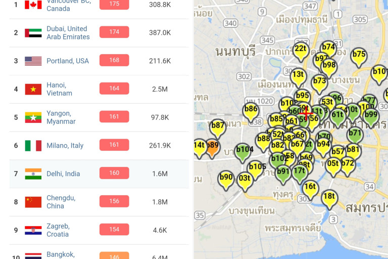 ในขณะที่ www.iqair.com ซึ่งรายงานคุณภาพอากาศและจัดอันดับเมืองมลพิษโลก โดยรายงานแบบเรียลไทม์ วันที่ 19 ต.ค.2565 เวลา 07.00 น.พบเช้านี้กทม.อยู่ในอันดับที่ 10 ของโลก โดยดัชนีคุณภาพอากาศอยู่ที่ 146 US AQI ส่วนเชียงใหม่ติดอันดับ 28 ของโลก โดยดัชนีคุณภาพอากาศอยู่ที่ 86 US AQI