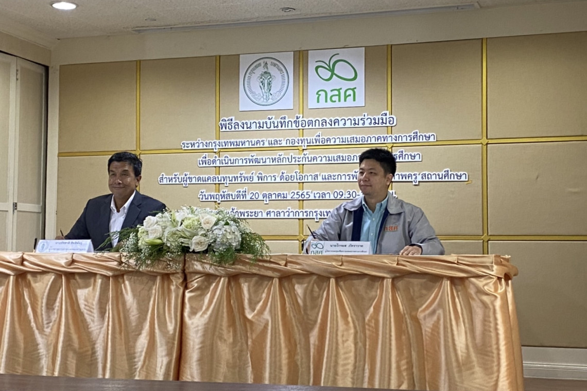 วันที่ 20 ต.ค.2565 เวลา 10.30 น.ที่ศาลาว่าการกทม.เสาชิงช้า นายชัชชาติ สิทธิพันธุ์ ผู้ว่าราชการกรุงเทพมหานคร พร้อมด้วย นายศานนท์ หวังสร้างบุญ รองผู้ว่าราชการกรุงเทพมหานคร ร่วมพิธีลงนามบันทึกข้อตกลงความร่วมมือระหว่างกรุงเทพมหานคร และกองทุนเพื่อความเสมอภาคทางการศึกษา(กสศ.) เพื่อดำเนินการพัฒนาหลักประกันความเสมอภาคทางการศึกษา สำหรับผู้ขาดแคลนทุนทรัพย์ พิการ ด้อยโอกาส และการพัฒนาครู สถานศึกษา โดยมี ดร.ประสาร ไตรรัตน์วรกุล ประธานกรรมการบริหารกองทุนเพื่อความเสมอภาคทางการศึกษา และ ดร.ไกรยศ ภัทราวาท ผู้จัดการกองทุนเพื่อความเสมอภาคทางการศึกษา(กสศ.) เข้าร่วม