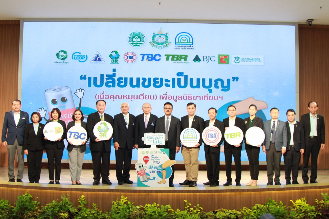 สำหรับการเปิดตัวโครงการ “เปลี่ยนขยะเป็นบุญ” (เมื่อคุณหมุนเวียน) เพื่อมูลนิธิขาเทียม ในสมเด็จพระศรีนครินทราบรมราชชนนี เป็นโครงการที่จะช่วยส่งเสริมให้ประชาชนนำกระป๋องเครื่องดื่มอลูมิเนียมที่ใช้แล้ว ส่งกลับคืนสู่กระบวนการรีไซเคิล เปลี่ยนเป็นมูลค่าสนับสนุนการดำเนินงานของมูลนิธิขาเทียม ในสมเด็จพระศรีนครินทราบรมราชชนนี โดยความร่วมมือจากหน่วยงานเครือข่าย ทั้งจากภาครัฐ ภาคเอกชน และกลุ่มอุตสาหกรรม จำนวน 9 หน่วยงาน ได้แก่ 1. กรมส่งเสริมคุณภาพสิ่งแวดล้อม 2. กรมควบคุมมลพิษ 3. มูลนิธิขาเทียม ในสมเด็จพระศรีนครินทราบรมราชชนนี 4. มูลนิธิการจัดการทรัพยากรอย่างยั่งยืน (มูลนิธิ 3R) 5. สมาคมอุตสาหกรรมเครื่องดื่มไทย 6. บริษัท ไทยเบเวอร์เรจ แคน จำกัด 7. บริษัท ไทยเบฟเวอเรจ รีไซเคิล จำกัด 8. กลุ่มบริษัท บีเจซี บิ๊กซี 9. บริษัท สถานีรีไซเคิล วงษ์พาณิชย์สุวรรณภูมิ จำกัด โดยมีเป้าหมายรวบรวมกระป๋องอลูมิเนียมใช้แล้วจำนวน 1,800,000 กระป๋อง กลับเข้าสู่กระบวนการรีไซเคิล และมีแนวทางในการขับเคลื่อนโครงการ โดยการเพิ่มการประชาสัมพันธ์กิจกรรมสำหรับผู้ที่สนใจ ได้เข้าร่วมกิจกรรม รวมทั้งการรณรงค์ให้ประชาชนมีการคัดแยกขยะกระป๋องอลูมิเนียมที่ใช้แล้ว ให้มีความรู้ความเข้าใจเรื่องการบริจาควัสดุอลูมิเนียม พร้อมทั้งขยายช่องทางการรับบริจาคให้ประชาชนเข้าถึงได้มากขึ้น นอกจากนี้ การรวบรวมอลูมิเนียมที่ได้รับบริจาคเข้าสู่กระบวนการรีไซเคิล โดยเครือข่ายผู้รวบรวม สามารถนำมาแปลงเป็นมูลค่าตามราคาที่รับซื้อ และสามารถนำรายได้ส่งต่อเป็นต้นทุนในการจัดหาอุปกรณ์และค่าใช้จ่ายต่างๆ ในการผลิตขาเทียม และสนับสนุนการดำเนินงานของมูลนิธิขาเทียม ในสมเด็จพระศรีนครินทราบรมราชชนนี