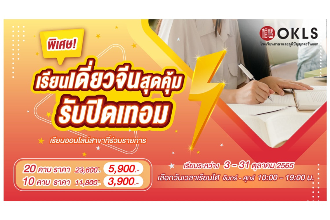 OKLS โรงเรียนภาษาและภูมิปัญญาตะวันออก ช่วยลดภาระผู้ปกครอง และแบ่งเบาค่าใช้จ่ายสำหรับบุตรหลานในช่วงปิดภาคเรียน จัดกิจกรรมมอบส่วนลดสูงสุดถึง 75 % สุดคุ้มค่าสำหรับคอร์สภาษาจีนแบบเรียนเดี่ยวกับครูผู้สอนตัวต่อตัวทุกหลักสูตร ไม่ว่าจะเป็น หลักสูตรภาษาจีนสำหรับเด็ก (เด็กเล็กเรียนจีน และเด็ก ๆ เรียนจีน) หลักสูตรภาษาจีนมาตรฐานสำหรับบุคคลทั่วไป โดยสามารถเลือกเรียนทั้งในรูปแบบออนไลน์และออนไซต์ที่สาขา พิเศษ! คอร์สเรียนเดี่ยวภาษาจีน 20 คาบ จากราคาปกติ 23,000 บาท ลดพิเศษเหลือเพียง 5,900 บาท และคอร์สเรียนเดี่ยวภาษาจีน 10 คาบ จากราคาปกติ 11,800 บาท ลดพิเศษเหลือเพียง 3,900 บาท สามารถเลือกเรียนวันจันทร์ - ศุกร์ ตั้งแต่เวลา 10.00 -19.00 น. โดยสมัครและเรียนตั้งแต่วันนี้ - 31 ตุลาคม 2565 เท่านั้น ที่สาขาของ OKLS (พาราไดซ์พาร์ค พารากอน ฟอร์จูนทาวน์ ฟิวเจอร์ปาร์ครังสิต เซ็นทรัลศาลายา และเซ็นทรัลเวสต์เกต) ดูรายละเอียดและสมัครเรียนทาง www.OKLS.net