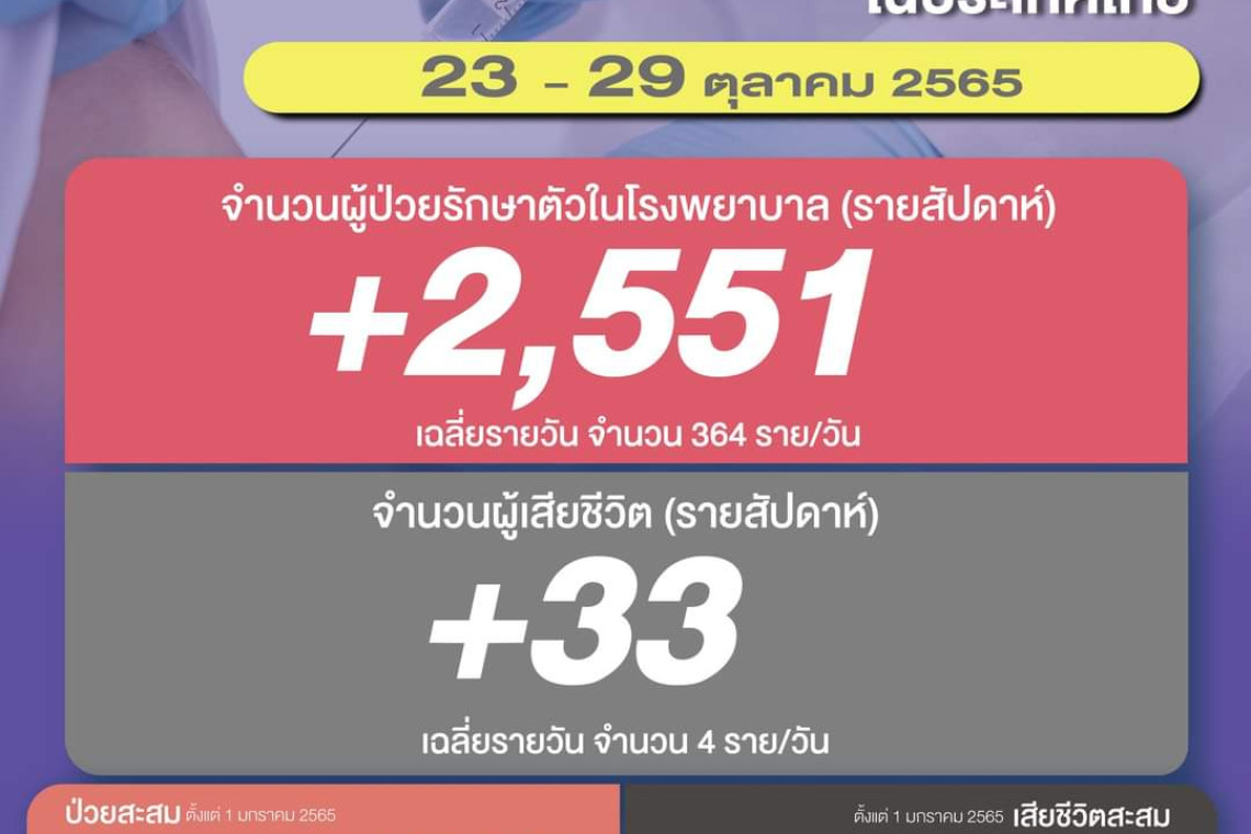 วันที่ 31 ต.ค.2565 ศูนย์ข้อมูล COVID-19 กรมประชาสัมพันธ์ รายงานสถานการณ์โรคโควิด-19 รายสัปดาห์ ระหว่างวันที่ 23-29 ตุลาคม 2565 พบ