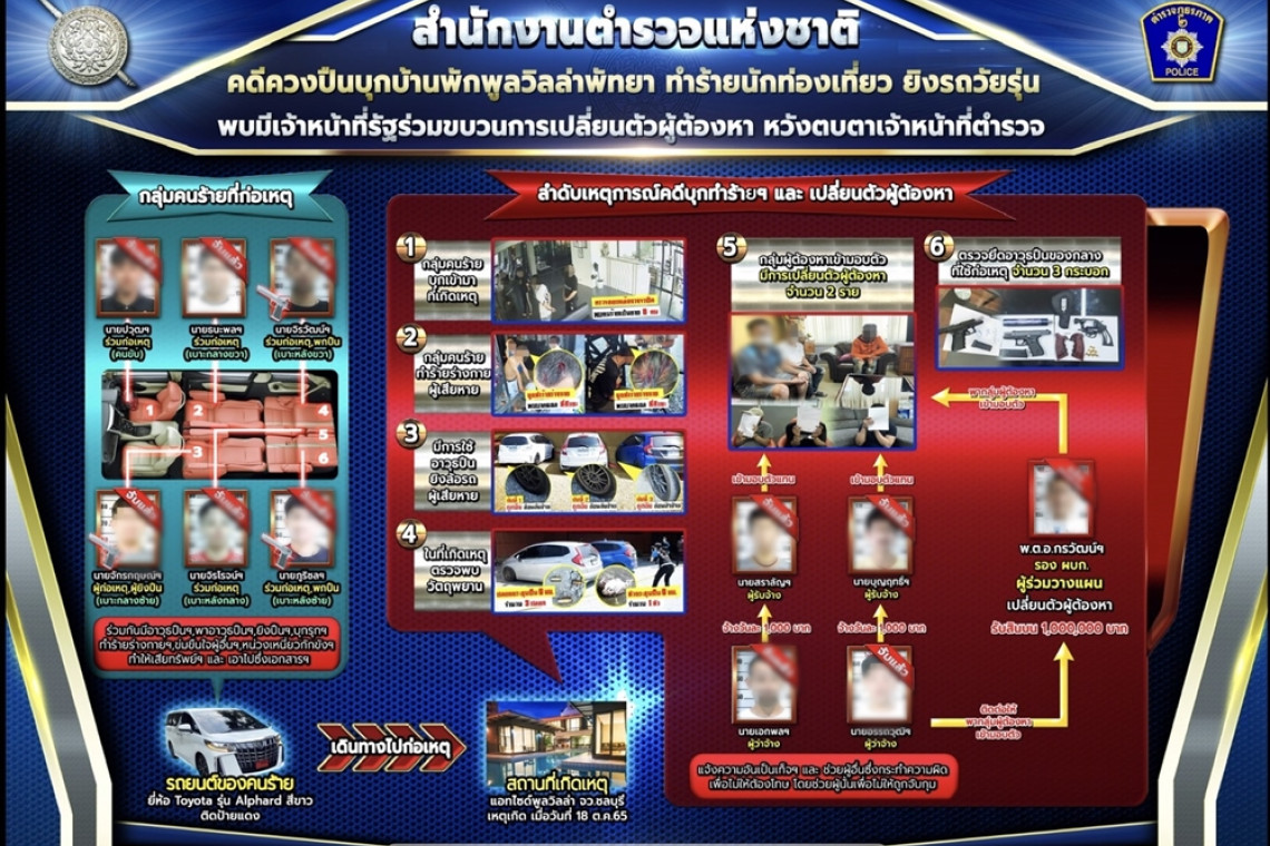 จากกรณีเมื่อวันที่ 18 ต.ค.65 ที่ผ่านมา ได้มีกลุ่มชายฉกรรจ์พร้อมอาวุธปืนบุกเข้าไปทำร้ายร่างกายกลุ่ม ผู้เสียหายซึ่งพักอยู่ที่พูลวิลล่าแห่งหนึ่ง ถ.จอมเทียน สาย 2 ต.หนองปรือ อ.บางละมุง จ.ชลบุรี มีผู้ได้รับบาดเจ็บ 4 ราย ตามที่ข่าวเสนอไปแล้ว