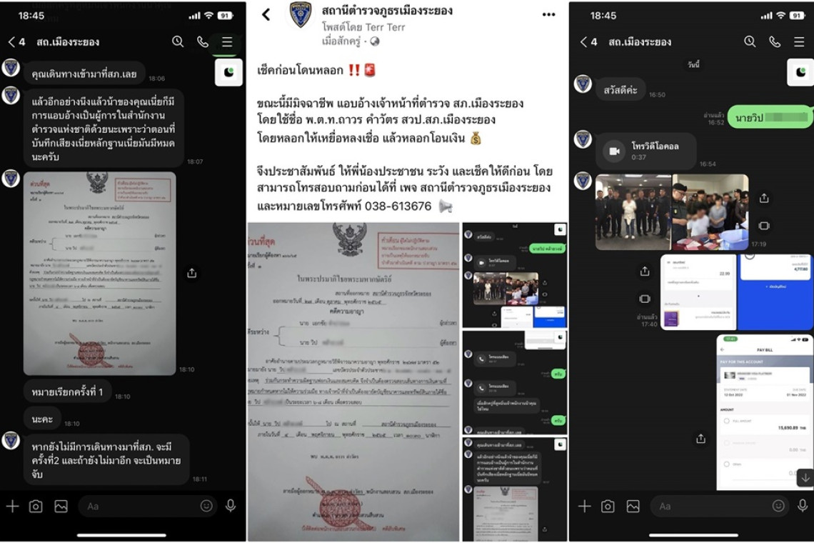 วันที่ 3 ต.ค.65 พ.ต.ท.ถาวร คำวัตร สวป.สภ.เมือง ระยอง ได้ กล่าวว่า ขณะ มีกลุ่มมิจฉาชีพ ที่แอบอ้าว ชื่อตำแหน่ง "พ.ต.ท.ถาวร คำวัตร" แล้ว โทร ไปหลอกเหยื่อรายหนึ่ง ซึ่งเป็นเจ้าหน้าที่ รพ.ระยอง ว่า มีความผิดฐานฟอกเงิน กำลังจะนำหมายค้นเข้าค้นบ้านพัก และ ขอตรวจสอบบัญชี เพื่อทำการอายัด พร้อมทั้งโชว์รูปในชุดเครื่องแบบ  แต่เหยื่อไหวทัน ได้โทรศัพท์มาสอบถาม ที่ สภ.เมือง ระยอง  จึงรอดพ้นการถูกหลอกมาได้