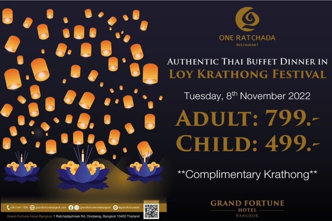 1.โรงแรมแกรนด์ฟอร์จูน กรุงเทพฯ พร้อมอิ่มหนำสำราญกับอาหารไทยจากทั่วทุกภาค อาทิ ข้าวซอย กุ้งอบวุ้นเส้น ยำส้มโอ ซีฟู้ดผัดผงกะหรี่ ผัดไทย ห่อหมอปลากราย น้ำพริกลงเรือ ถุงทองกุ้ง รวมไปถึงอาหารทะเลต่างๆ และเมนูพิเศษอีกมากมาย ในบุฟเฟ่ต์มื้อเย็นวันที่ 8 พฤศจิกายน 2565 เวลา 18.00-22.00 น. ราคาพิเศษผู้ใหญ่ท่านละ 799 บาท เด็กท่านละ 499 บาท รับฟรีกระทงสำหรับแขกผู้มีเกียรติทุกท่านเมื่อสำรองโต๊ะล่วงหน้าอย่างน้อย 1 วัน สอบถามรายละเอียดเพิ่มเติมและสำรองที่นั่งโทร 02 641 1500Line @GrandFortuneBKK