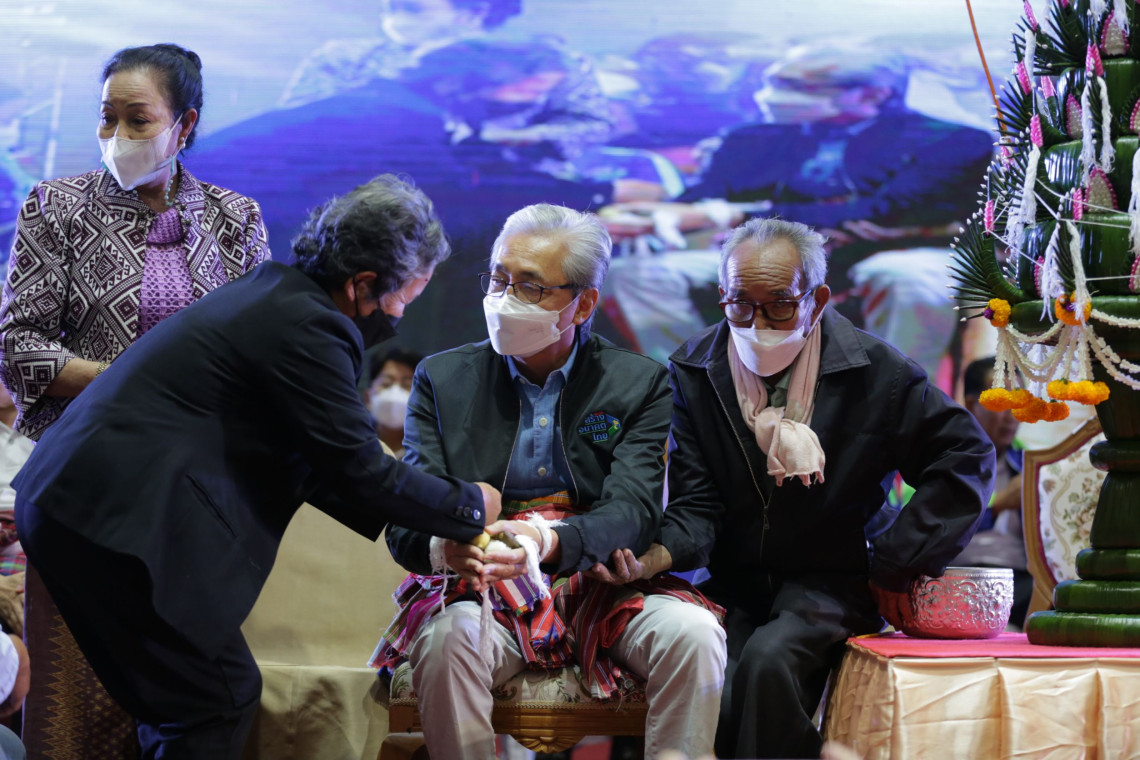 ทั้งนี้ เมื่อนายสมคิด และแกนนำพรรคเดินทางมาถึง ได้มีชาวบ้านนำผ้าขาวม้ามาผูกเอวต้อนรับตามธรรมเนียมคนอีสาน พร้อมกับตะโกนว่า “นายกฯสมคิด นายกฯสมคิด” ทำให้นายสมคิดยิ้มเขินๆ จากนั้นได้มีพิธีบายศรีสู่ขวัญ โดยพ่อแก่แม่แก่ ที่ขึ้นไปทำพิธีผู้ข้อต่อแขนนายสมคิด คือ คุณพ่อหมี สาเลศ อายุ84 ปี ชาว อ.บุญฑริก คุณแม่เพ็ญศรี บุญเลิศสว่าง อายุ 75 ปี ชาว อ.วารินชำราบ ขณะที่พราหมณ์ผู้ประกอบพิธีคือ พราหมณ์ พรมมา ธิมาทา ซึ่งเป็นผู้ที่ชาวอุบลราชธานีให้ความเคารพนับถือ นอกจากนี้ ยังมีตัวแทนพี่น้องจากทั่วภาคอีสานจำนวน 19 คน ขึ้นผูกข้อต่อแขนรับขวัญนายสมคิด ด้วยบรรยากาศแบบเป็นกันเอง