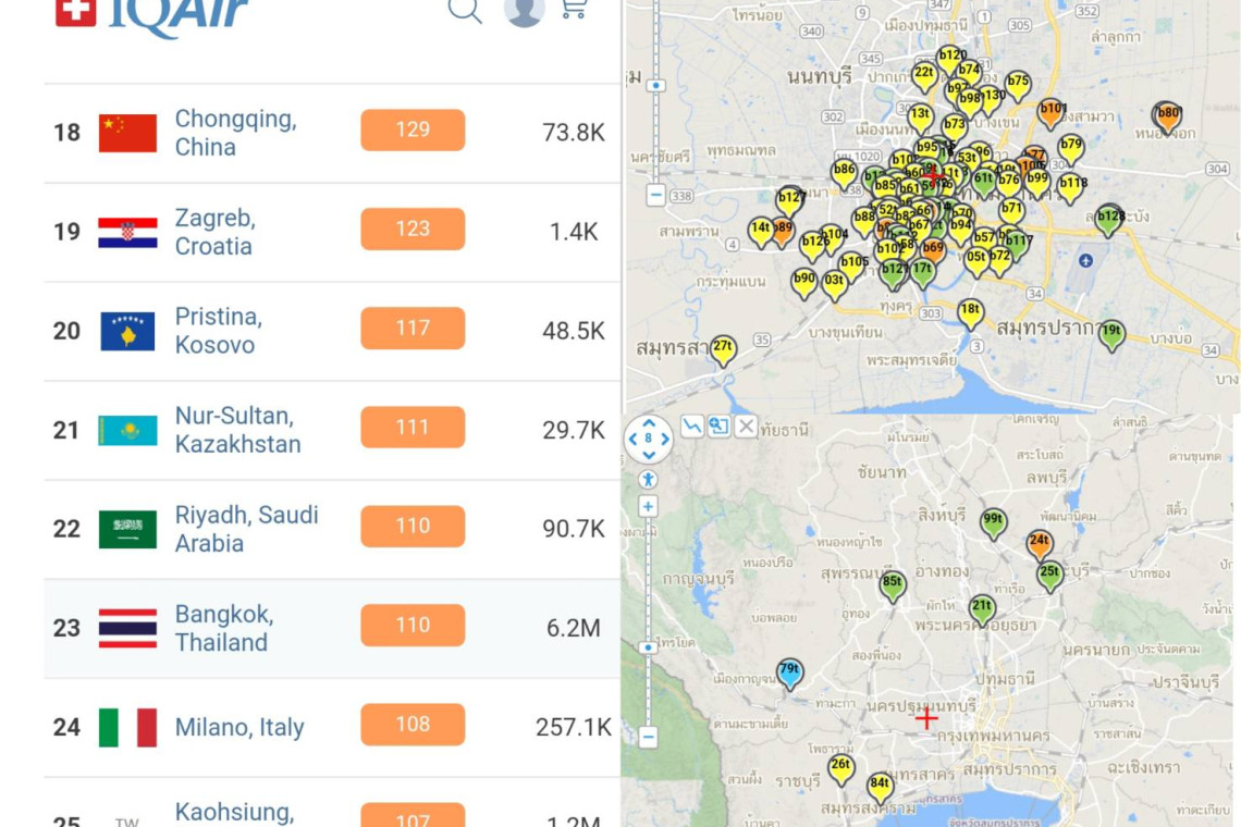 ในขณะที่ www.iqair.com ซึ่งรายงานคุณภาพอากาศและจัดอันดับเมืองมลพิษโลก โดยรายงานแบบเรียลไทม์ วันที่ 8 พ.ย.2565 เวลา 09.00 น.พบเช้านี้กทม.อยู่ในอันดับที่ 23 ของโลก โดยดัชนีคุณภาพอากาศอยู่ที่ 110 US AQI ส่วนเชียงใหม่ติดอันดับ 34 ของโลก โดยดัชนีคุณภาพอากาศอยู่ที่ 84 US AQI