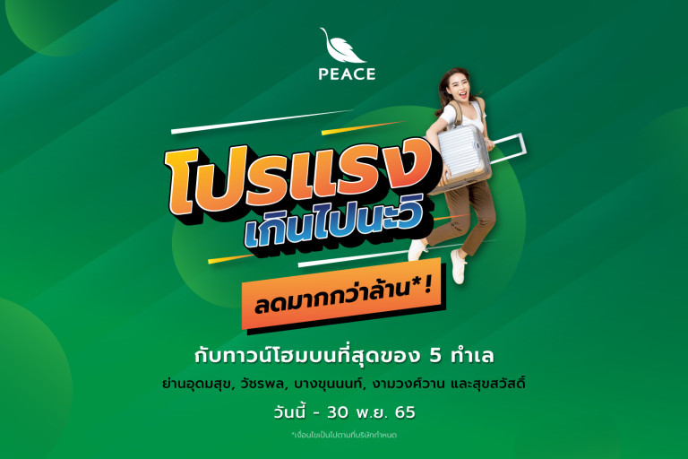 บริษัท พีซแอนด์ลีฟวิ่ง จำกัด (มหาชน) หรือ PEACE ผู้พัฒนาอสังหาริมทรัพย์ประเภทที่อยู่อาศัยแนวราบที่มีประสบการณ์มากว่า 30 ปี ส่งโปรโมชั่นสุดพิเศษ "โปรแรงเกินไปนะวิ!!" กระตุ้นยอดขายไตรมาสสุดท้ายของปี 2565 เอาใจลูกค้าที่สนใจเป็นเจ้าของทาวน์โฮมคุณภาพ 5 โครงการ ที่ก่อสร้างด้วยอิฐมอญแดง พร้อมลงเสาเข็มหลังบ้านให้กับทุกหลัง หลากทำเลที่ร่วมแคมเปญ ไม่ว่าจะเป็นอุดมสุข, วัชรพล, พุทธบูชา, งามวงศ์วาน, บางขุนนนท์ ในราคาเริ่มต้นที่ 3.50 ล้านบาท* โดยมอบส่วนลดสุดแรง ลดมากกว่าล้าน* พร้อมดีลสุดพิเศษ จ่าย 10,000 บาท* เข้าอยู่ได้เลย เมื่อจองภายในวันที่ 30 พฤศจิกายนนี้เท่านั้น
