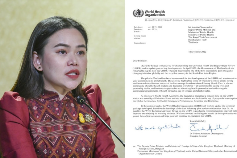 วันที่ 13 พ.ย.65 น.ส.ไตรศุลี ไตรสรณกุล รองโฆษกประจำสำนักนายกรัฐมนตรี กล่าวว่า นายเท็ดรอส อัดฮานอม กีบรีเยซุส (Tedros Adhanom Ghrebreyesus) ผู้อำนวยการใหญ่ องค์การอนามัยโลก หรือ WHO ได้มีหนังสือส่งตรงถึงนายอนุทิน ชาญวีรกูล รองนายกรัฐมนตรีและรมว.สาธารณสุข ระบุถึงความคืบหน้าที่ WHO ได้เลือกประเทศไทยเป็น 1 ใน 4 ประเทศจากทั่วโลกในและเป็นประเทศเดียวเอเชียตะวันออกเฉียงใต้ ในการดำเนินโครงการกลไกทบทวนการเตรียมความพร้อมกรณีภาวะฉุกเฉินทางสาธารณสุขและสุขภาพถ้วนหน้า (Universal Health and Preparedness Review : UHPR) และถอดบทเรียนความสำเร็จการรับมือวิกฤตโควิด-19