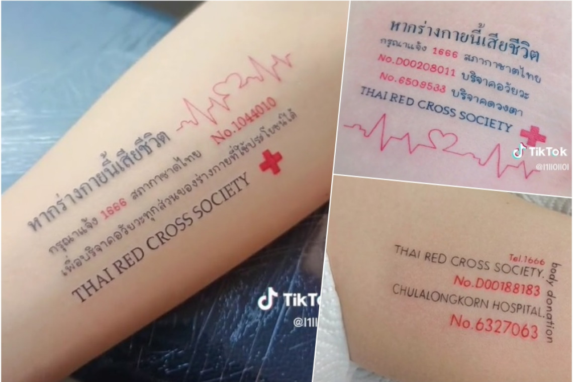 เป็นอีกเรื่องราวๆดีในโลกโซเชียล เมื่อสมาชิก TikTok บัญชี l1ll0ll0l ซึ่งเป็นช่างสักลาย ร้านอยู่แถวสวนสุนันทา/สวนดุสิต ได้โพสต์คลิปภาพลายสักและบทสนทนา โดยมีลูกค้าส่งภาพลายสักซึ่งระบุข้อความว่า "หากร่างกายนี้เสียชีวิต กรุณาแจ้ง 1666 สภากาชาดไทย เพื่อบริจาคอวัยวะทุกส่วนของร่างกายที่ใช้ประโยชน์ได้ THE THAI RED CROSS SOCIETY" ก่อนถามราคาเท่าไหร่ ซึ่งช่างสักตอบว่า "ไม่มีค่าใช้จ่ายครับ .. ผมชอบสนับสนุนด้านนี้"