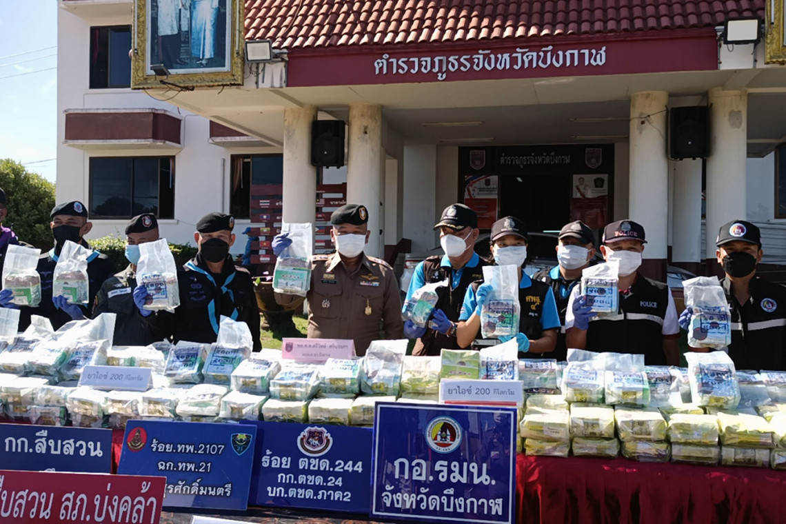 เมื่อเวลา 11.30 น.วันที่ 15 พ.ย.ที่หน้าสำนักงานตำรวจภูธรจังหวัดบึงกาฬ พล.ต.ต.ตรีวิทย์ ศรีประภา ผบก.ภ.จว.บึงกาฬ พ.ต.อ.อารัก มะสาทานัง รอง ผบก. พ.ต.อ.เกียรติศักดิ์ บำรุงสวัสดิ์ ผกก.สืบสวน จว.บึงกาฬ พ.ต.อ.พงษ์ศักดิ์ วิริยะเขษม ผกก.สภ.นุ่งคล้า แถลงผลการตรวจยึดยาไอซ์ จำนวน 200 กิโลกรัม มูลค่า 60 ล้านบาทที่ ตรวจยึดมาได้ในป่าสวนยูราลิปตัส ทางทิศตะวันออกบ้านสมพร เขตพื้นที่บ้านสมพร หมู่ที่ 8 ตำบลโคกกว้าง อำเภอยุ่งคล้า จังหวัดบึงกาฬ ส่วนกลุ่มผู้ต้องสงสัยจำนวน 3 คนวิ่งหลบหนีไปได้ ซึ่งเป็นคนในพื้นที่ ได้ให้ตำรวจพิสูจน์หลักฐานตรวจหาลายนิ้วมือแฝงพร้อมกับเรียกมาตรวจเก็บ DNA เพื่อเปรียบเทียบลายนี้วมือที่เก็บได้แล้วและขอศาลเพื่อออกหมายจับมาดำเนินคดี