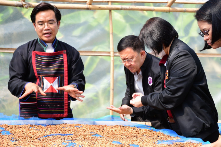 ดร.ดนุช ตันเทอดทิตย์ เลขานุการ รมว.การอุดมศึกษา วิทยาศาสตร์ วิจัยและนวัตกรรม (อว.) พร้อมด้วย น.ส.สุณีย์ เลิศเพียรธรรม ผู้ตรวจราชการ อว. และ น.ส.ทิพวัลย์ เวชชการัณย์ ผอ.กลุ่มอุทยานวิทยาศาสตร์ กองส่งเสริมและประสานเพื่อประโยชน์ทางวิทยาศาสตร์ วิจัยและนวัตกรรม สำนักงานปลัด อว. ลงพื้นที่เยี่ยมชมสวนกาแฟอาข่าและกิจการอาข่า จังเกิ้ล คอฟฟี่ (Akha Jungle Coffee) ซึ่งอุทยานวิทยาศาสตร์มหาวิทยาลัยแม่ฟ้าหลวง (มฟล.) เข้าไปสนับสนุน มีนายธนพล เฌอมือ หรืออาจือ เป็นผู้ประกอบการ นำชมอุตสาหกรรมกาแฟ
