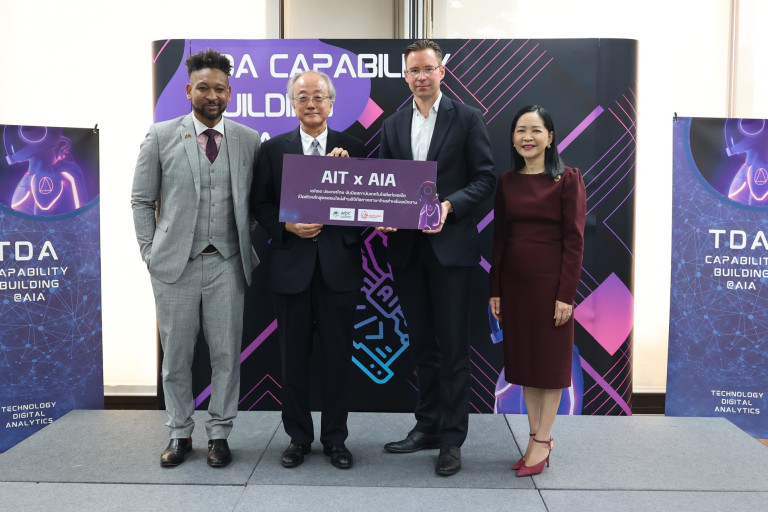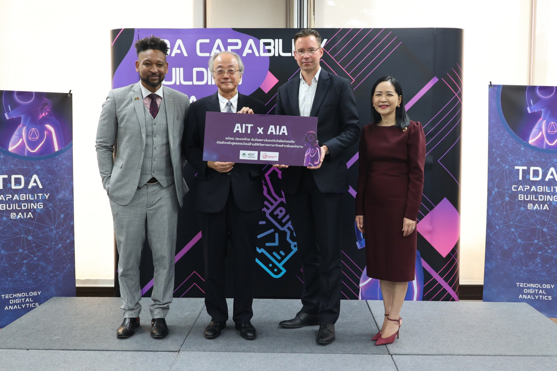 เอไอเอ ประเทศไทย นำโดย ด็อกเตอร์ คริสเตียน โรแลนด์ (ที่ 2 จากขวา) ประธานเจ้าหน้าที่ฝ่ายกลยุทธ์และดิจิทัล พร้อมด้วย นางศรัณยา เทียนถาวร ประธานเจ้าหน้าที่ฝ่ายทรัพยากรบุคคล เดินหน้าขับเคลื่อนพัฒนาบุคลากรให้มีความรู้ ทักษะ ความสามารถด้านเทคโนโลยี ดิจิทัล และการวิเคราะห์ข้อมูล (Technology, Digital and Analytics – TDA) อย่างต่อเนื่อง ล่าสุดได้จับมือกับสถาบันเทคโนโลยีแห่งเอเชีย (Asian Institute of Technology - AIT) สถาบันการศึกษานานาชาติที่มีชื่อเสียงระดับโลกและมีผลงานวิจัยเป็นเลิศ นำโดย Professor Kazuo Yamamoto (ที่ 2 จากซ้าย), President of Asian Institute of Technology และ Dr. Christopher Garnier, Executive Director of Asian Institute of Technology Extension (AIT Extension) ที่ร่วมกันพัฒนาหลักสูตรออนไลน์ด้านดิจิทัลภาคภาษาไทยขึ้นเป็นครั้งแรก โดย AIT Extension ซึ่งเป็นหน่วยงานภายใต้สังกัด AIT เป็นผู้ร่วมพัฒนาหลักสูตรดังกล่าว เพื่อมุ่งเพิ่มศักยภาพในการทำงานและทักษะที่ทันสมัยให้แก่บุคลากรของเอไอเอ ประเทศไทย ให้พร้อมรับมือกับการทำงานในโลกแห่งอนาคต ตลอดจนสามารถตอบสนองความต้องการของลูกค้าได้อย่างรวดเร็วและแม่นยำ เพื่อสนับสนุนให้ลูกค้าทุกคนมีสุขภาพและชีวิตที่ดีขึ้น ตามคำมั่นสัญญา ‘Healthier, Longer, Better Lives’