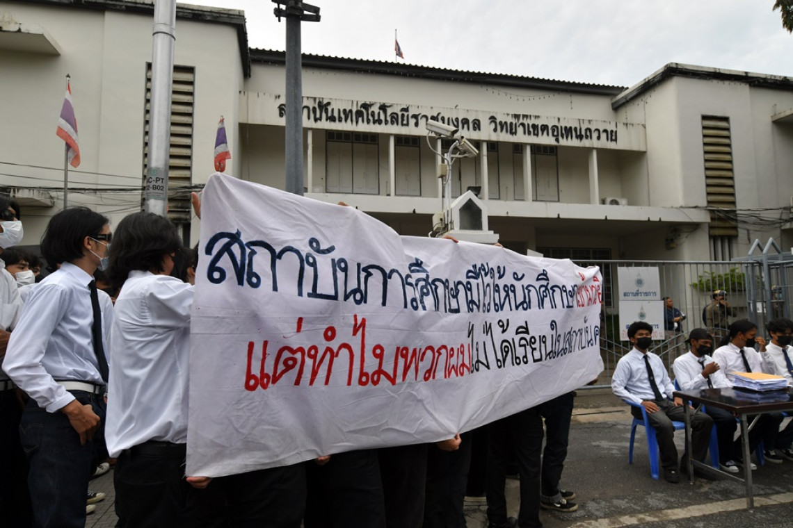 นักศึกษาอุเทนถวาย รวมตัวประท้วงปิดถนนหน้ามหาวิทยาลัย เรียกร้องให้คณบดีเจรจาตามข้อเรียกร้อง ให้นักศึกษาปี 1 กลับเข้ามาเรียนออนไซต์ได้ตามปกติ เนื่องจากสถานการณ์โควิดผ่อนคลายแล้ว แต่ยังต้องเรียนออนไลน์แบบ100 เปอร์เซ็นต์ และยังต้องจ่ายค่าเทอมเต็มอัตรา ใครฝ่าฝืนถูกพักการเรียน