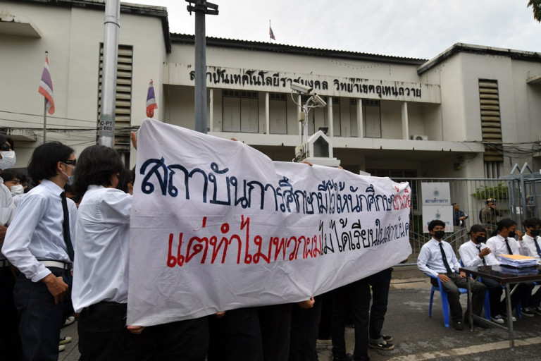 เมื่อเวลา 11.00 น. วันที่ 24 พ.ย.65 นักศึกษาคณะวิศวกรรมศาสตร์และสถาปัตยกรรมศาสตร์ มหาวิทยาลัยเทคโนโลยีราชมงคลตะวันออก วิทยาเขตอุเทนถวาย กว่า 400 คน รวมตัวเรียกร้อง ปิดถนนหน้ามหาวิทยาลัย ขอให้คณบดีออกมารับหนังสือ และเจรจาตามข้อเรียกร้องของนักศึกษา กรณีที่คณบดียังไม่อนุญาตให้นักศึกษาชั้นปีที่ 1 กลับเข้ามาเรียนออนไซต์ตามปกติ แต่ยังให้เรียนออนไลน์ ซึ่งนักศึกษาไม่เข้าใจการเรียนการสอนเนื่องจากเป็นภาคปฏิบัติเป็นส่วนใหญ่ รวมทั้งนักศึกษายังเสียค่าบำรุงการศึกษาตามปกติ ไม่ได้รับการลดหย่อน จึงอยากเรียกร้องให้มีพิจารณาในเรื่องนี้ และอนุญาตให้นักศึกษาชั้นปีที่ 1 กลับเข้าเรียนตามปกติในมหาวิทยาลัย